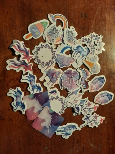 Наклейки очень красивые. Все дело в том, что один из них был нагнут на меня, но цена, которую у вас есть, и количество наклеек не имеет значения. В общей сложности 46 наклеек, 23 разных дизайна, 2 наклейки каждого дизайна и отделка Brillo.