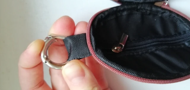me llegó muy rápido, es tal cual la foto, la anilla de arriba es un mini mosquetón que te vale para colgarlo donde quierad, tiene dos compartimientos uno de ellos para llaves y otro con una cremallera, estoy muy satisfecha con la compra