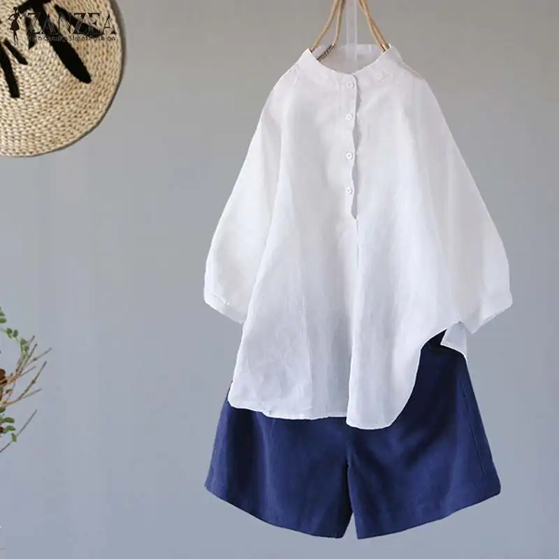 Летняя туника, топы 2021, женская блузка из хлопка и льна с воротником-стойкой и рукавами-фонариками