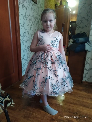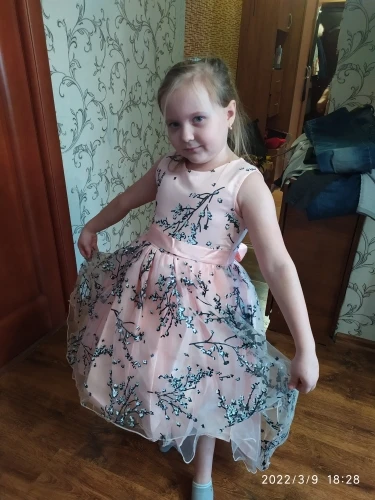 шикарное платье, пришло раньше времени, девочке 6.5 лет но брала размер 8, девочка не худенькая вошла в платье только только, если хотите не на 1 раз то берите больше размер особенно на полноватых детей, прошито всё отлично претензий нет, без запаха, цветочки не вышиты это покраска, ещё не стирали не знаю как после стирки себя поведут, платье и продавца рекомендую, на фото платье с подьюбником, рост ребёнка 122см, ог 70 примерно