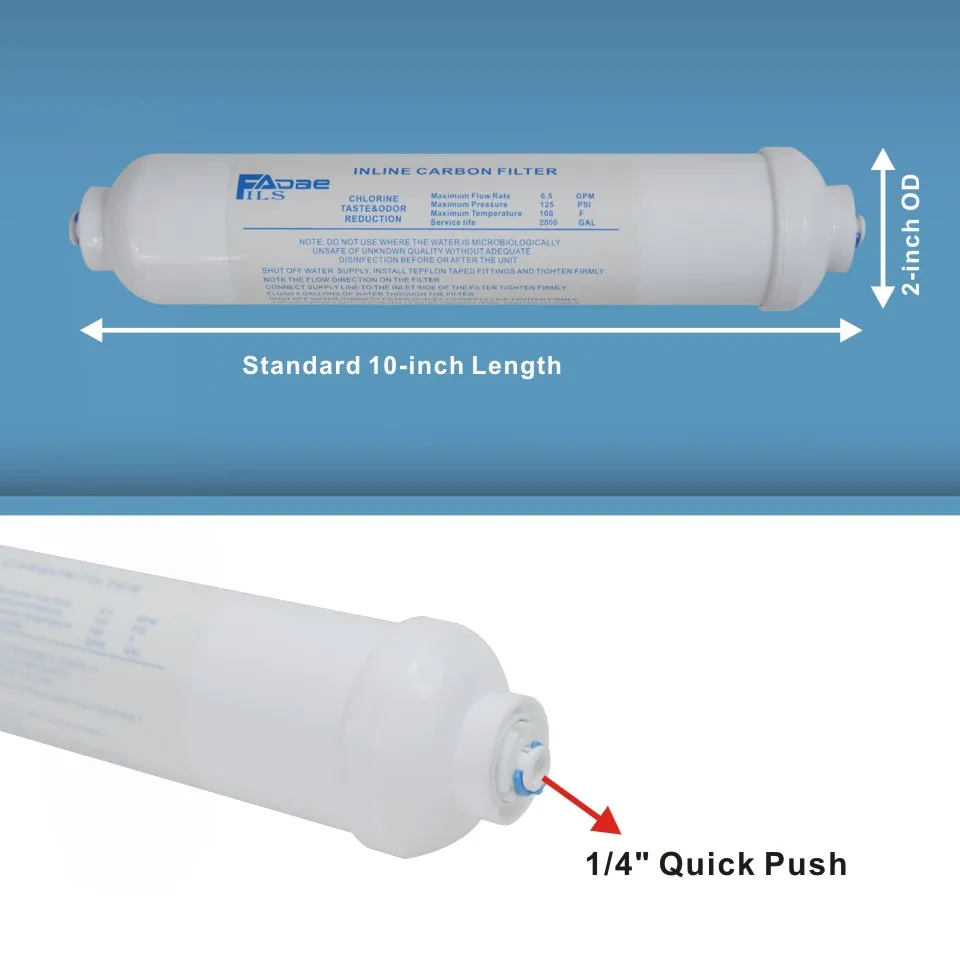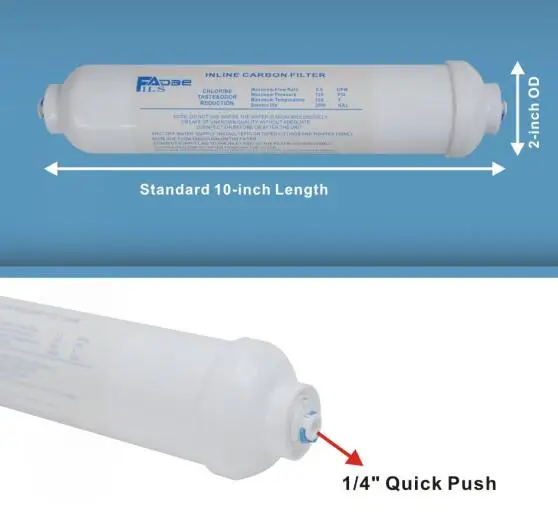 Встроенный кокосовый угольный фильтр для воды с 1/4 "быстрое соединение предназначены для удаления неприятного вкуса и запаха и уменьшения отложений для получения более чистой, ясной, лучшей дегустации воды. Встроенный кокосовый карбоновый фильтр для воды легко устанавливается на линии воды к автоматическому льдогенератору, кулеру воды, холодильнику, системе обратного осмоса или системе дозирования воды.