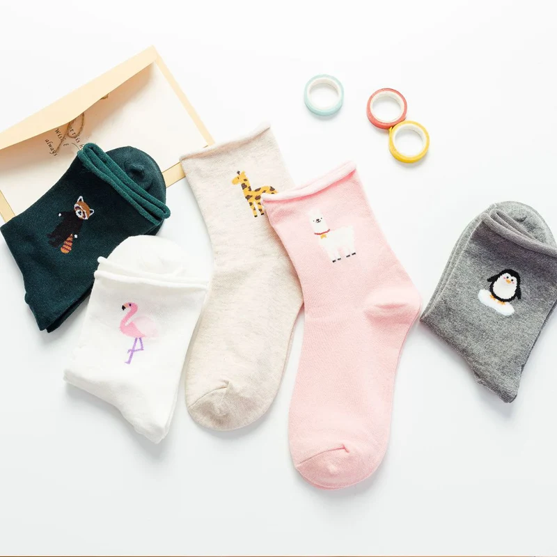 Милые Креативные Хлопковые женские носки в стиле Харадзюку с изображением фламинго, жирафа, пингвина, енота, милые забавные мультяшные носки, модные кавайные подарки