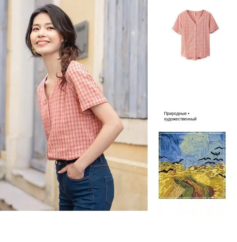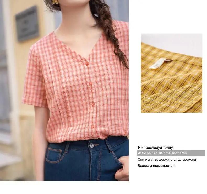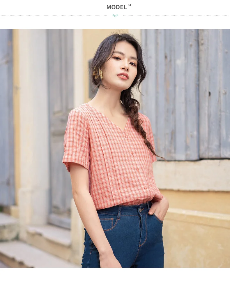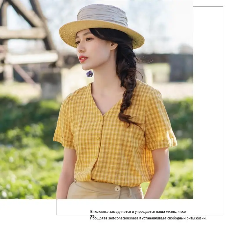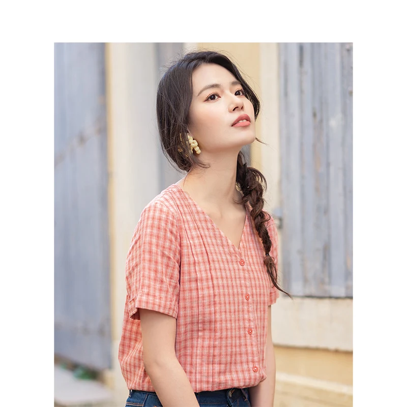 INMAN Летняя женская клетчатая рубашка с v-образным вырезом в стиле ретро