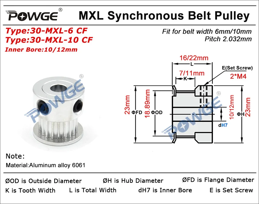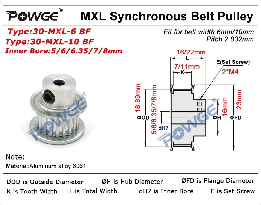 Зубчатый шкив POWGE Trapezoid 22 зубца MXL, отверстие 516678 мм для...