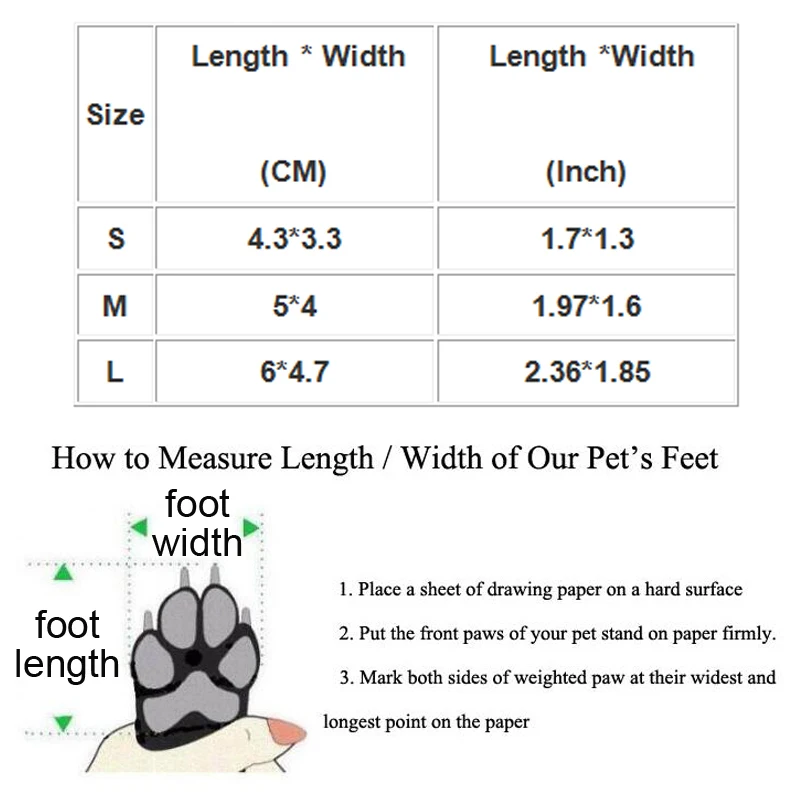 -Выберите длину и ширину собачья обувь не может быть меньше, чем длина и ширина для больших собак, для ног, должно быть больше, чем для больших собак, таблице Согласно длине стопы и широкий 0,5 см.