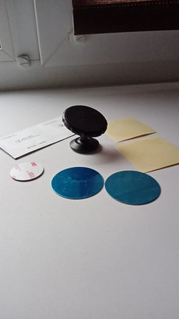 Дошло за месяц. В коробочке лежало всё, что было заявлено продавцом. Держатель приклеился на мертво, правда я дал ему пару дней и только потом первый раз попробовал повесить телефон. Металлическую пластину не стал клеить на телефон, просто положил её под силиконовый чехол, держится нормально, телефон не сползает.