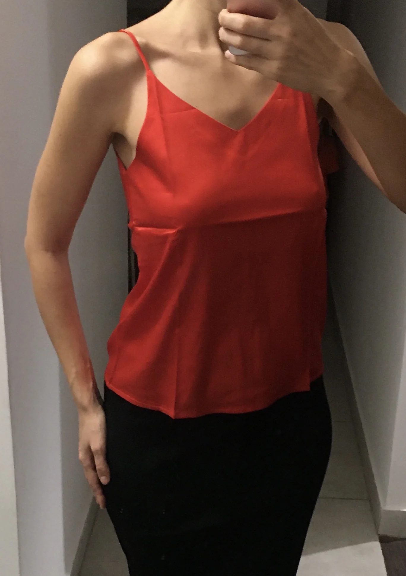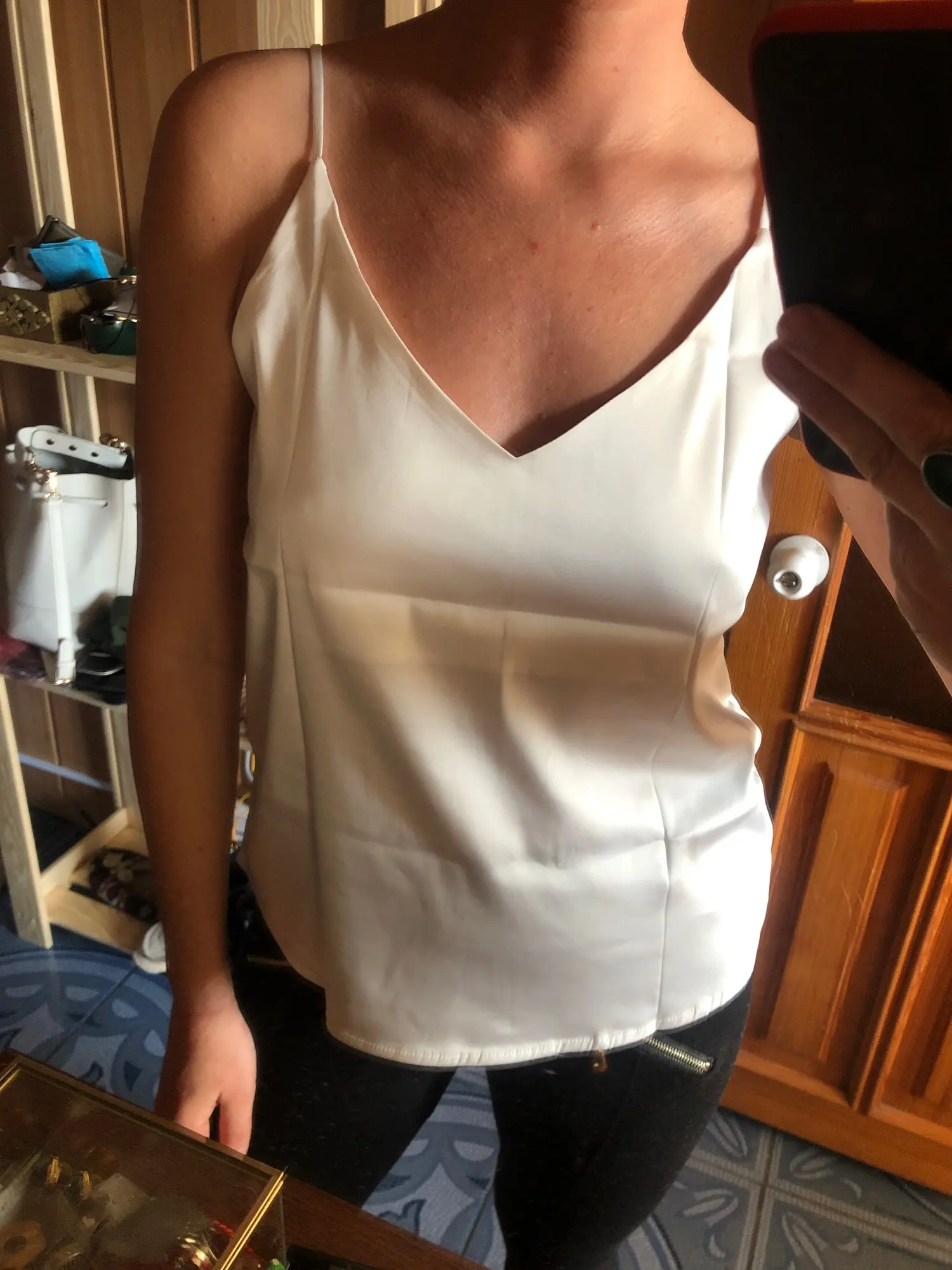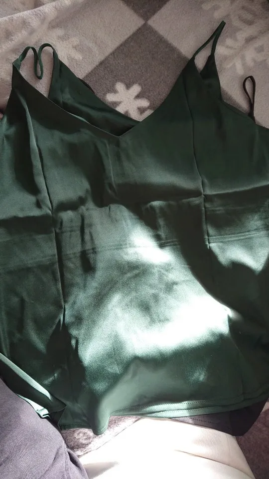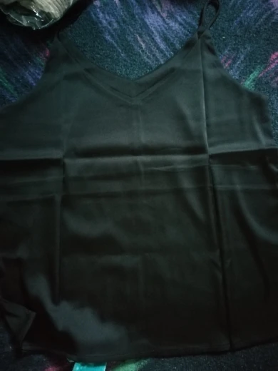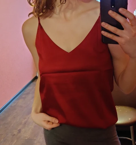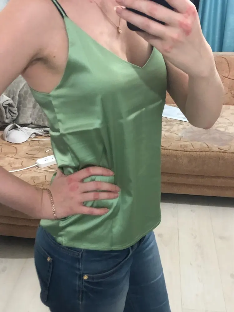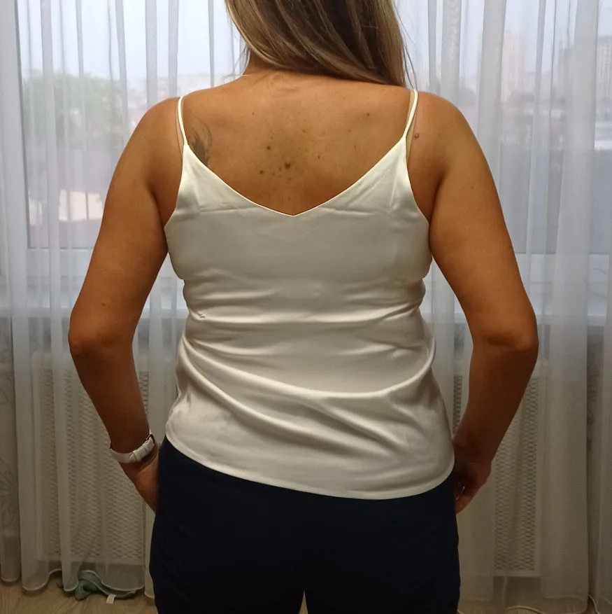 Просто обалденный топ!!! На распродаже заказала несколько у разных продавцов, и этот самый лучший. Ткань плотная, полуматовая, очень приятная на ощупь, и что самое главное для меня, не электризуется и не липнет к телу! Честно, я в восторге. Сшито аккуратно, никаких торчащих ниток. По переду и спинке V-образный вырез, один более глубокий. В верхней части топа (и спереди, и сзади) имеется второй слой ткани,поэтому можно носить без белья.