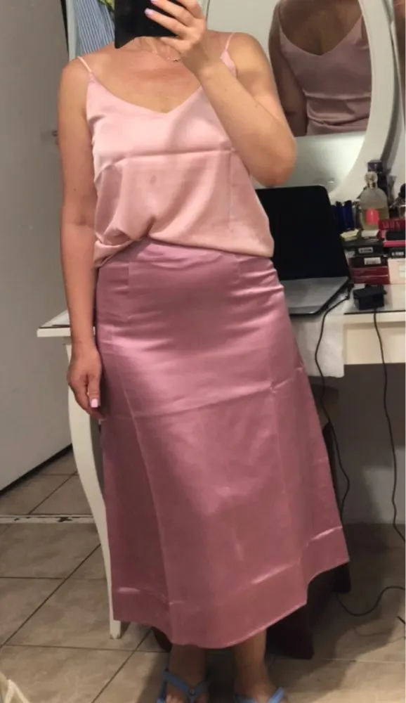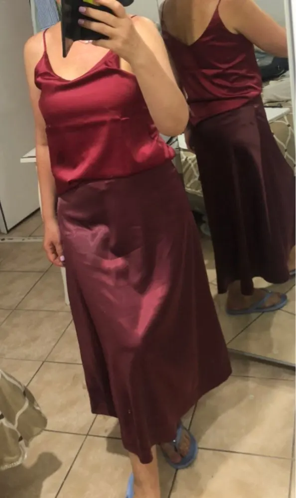 на удивление приличное качество, на размер 42-55 заказала М, сел как надо, свободно спадает. Единственный нюанс- топ короткий, только с завышенной талией носить
