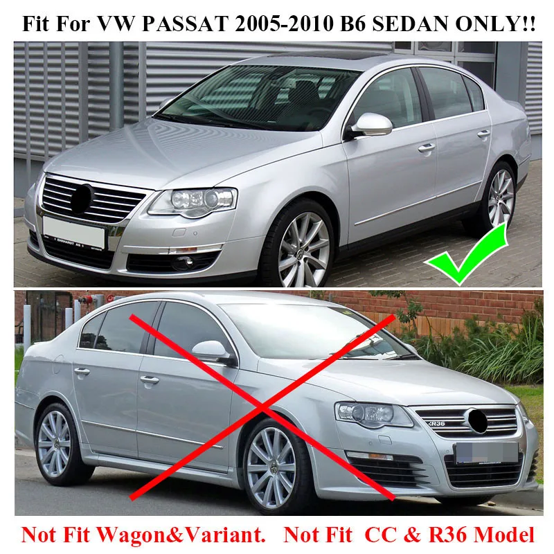Не подходит для B5 или B7 (подходит только для модели автомобиля на картинке, а не для других) Не подходит для вагона и варианта. Не подходит для модели CC & R36 Только OEM шасси, не совместимо с боковыми юбками (наземные комплекты) или модификациями тела