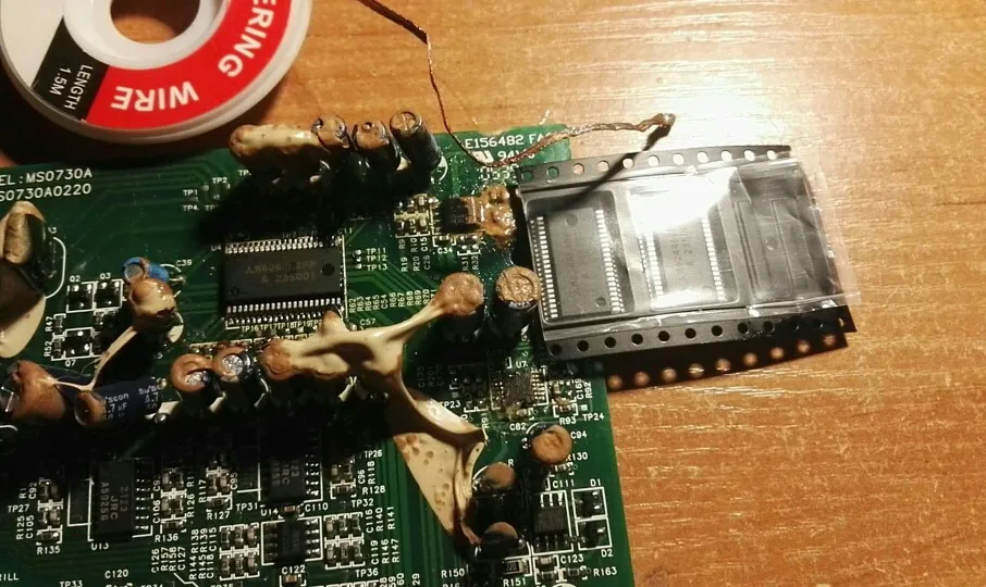 Супер, все работает...оживил Creative G500! ) Если у вас сгорел зеленый предохранитель на верхней плате рядом с большим резистором, то скорее всего у вас накрылась именно эта микруха. По маркировке, вроде как, производства Митсубиси Япония, а там хз =)