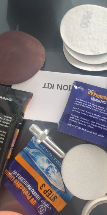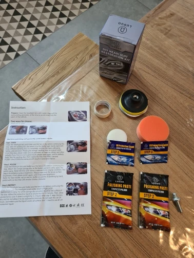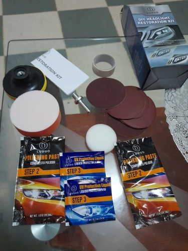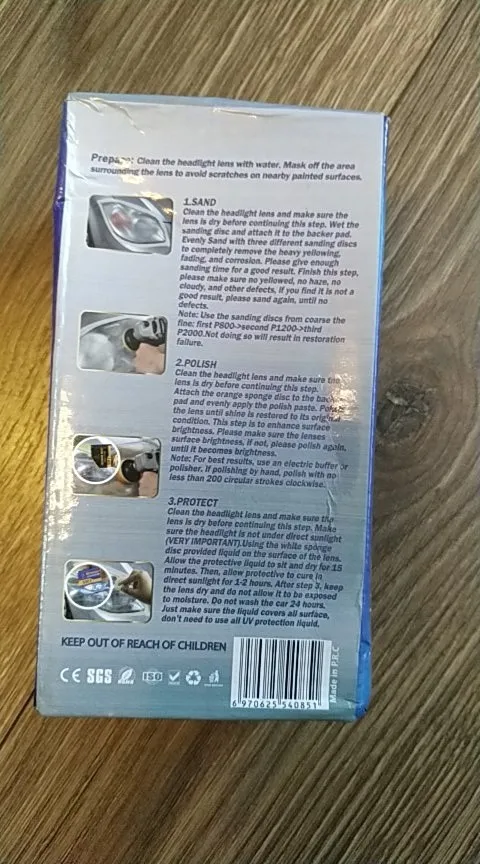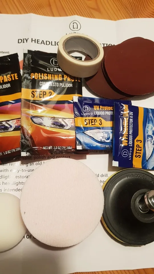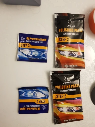 Во-первых, продавец очень хороший и полезный. У меня были некоторые проблемы с пониманием инструкций, и он мне очень помогли. Продукт работает отлично, насколько я могу видеть. Я попробовал использовать дрель с насадками, но моя дрель была недостаточно сильной, поэтому я сделал это вручную. В конце полировки фары все еще были немного туманными, поэтому я был расстроен, что, возможно, я сделал что-то неправильно или, возможно, продукт не был хорошим, но после того, как я надел УФ-защиту, они стали супер четкими и красивыми, так же как и новые! Я очень доволен покупкой!
