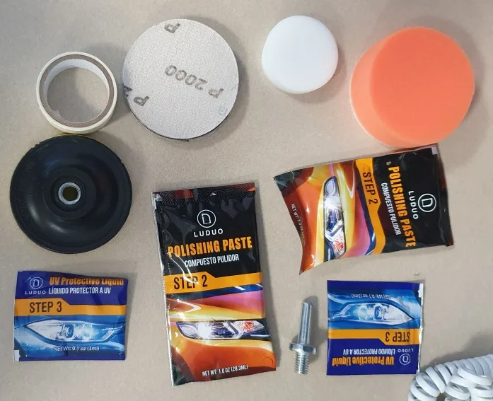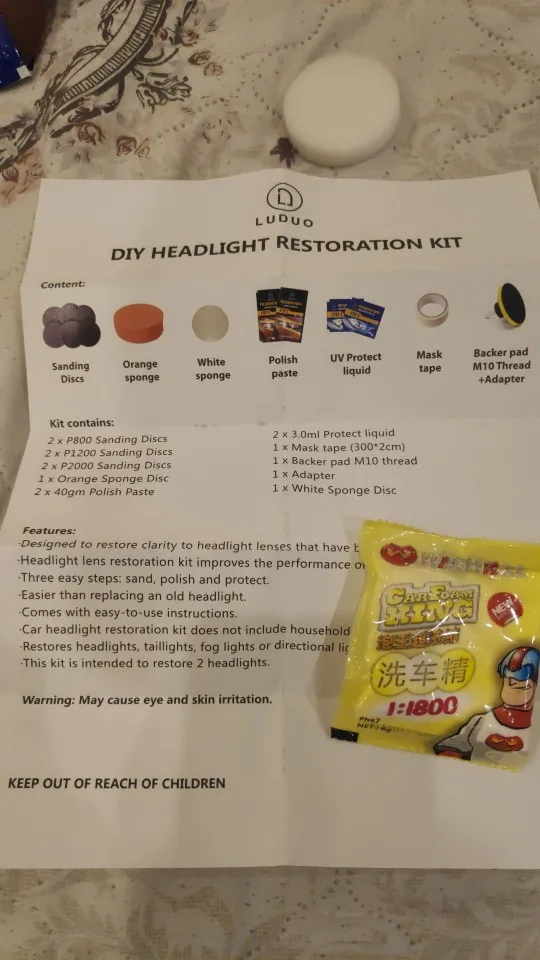 Товар в порядке. Бумажная лента и шлифовальная бумага не достаточно для обоих фар, вы должны купить больше. Вам нужно быть очень внимательными при полировке жидкости, не позволяйте ей упасть непосредственно к фарам, вы получите пятна.