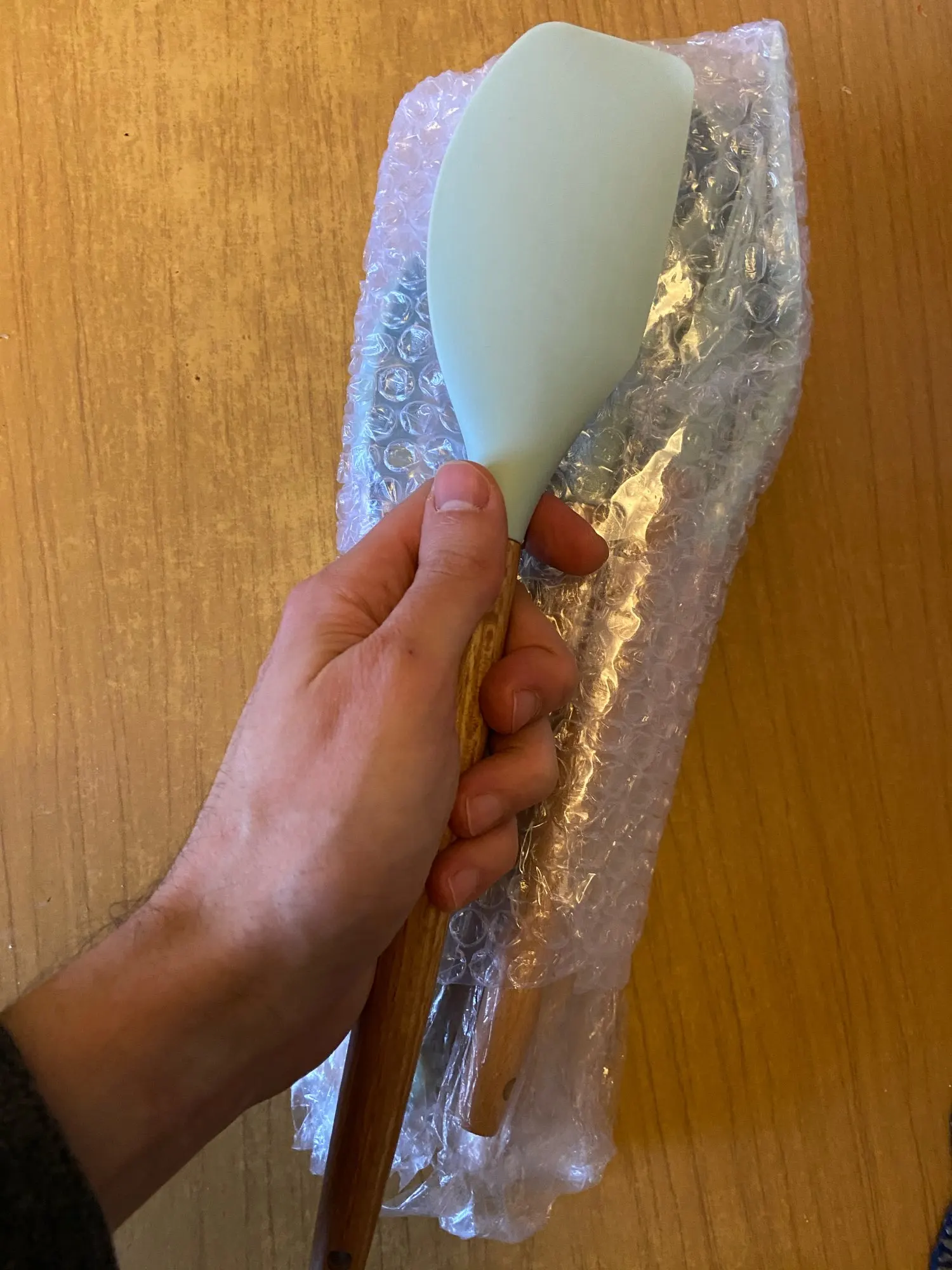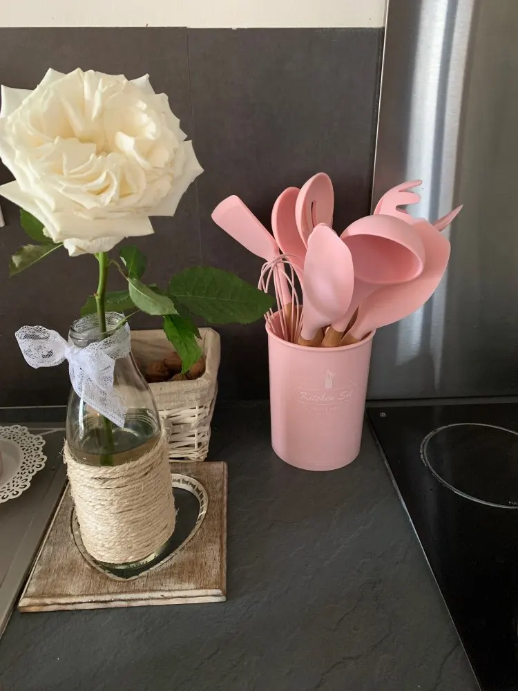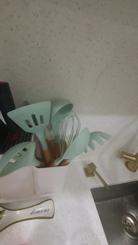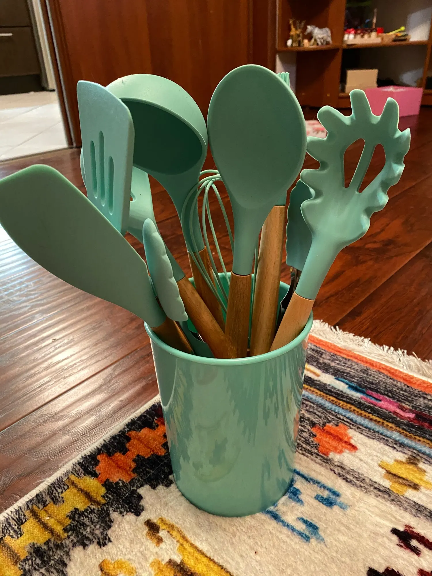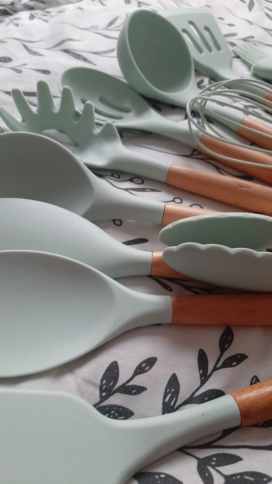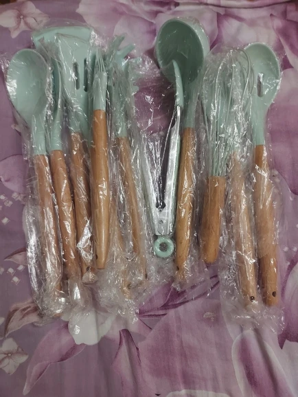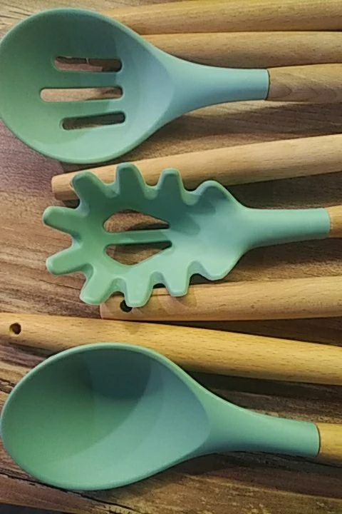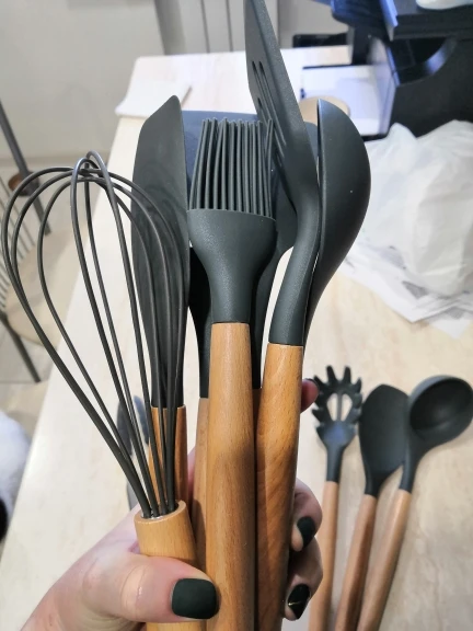 Цвет красивый и эффектный. Ручка деревянная и весит немного, но это нормально. Силикон выглядит хорошо. Их можно положить в посудомоечную машину