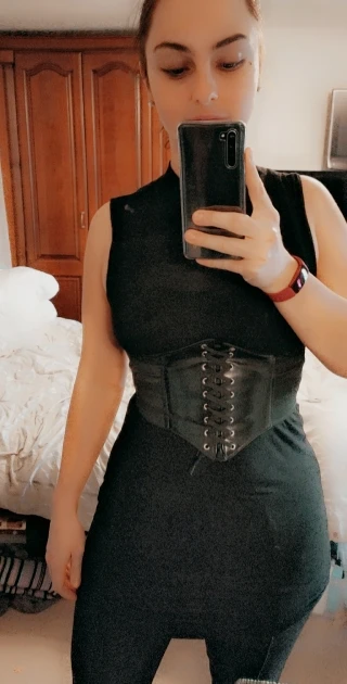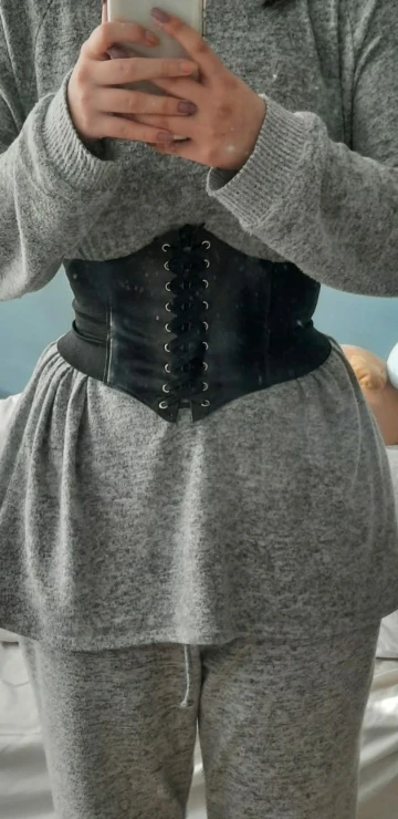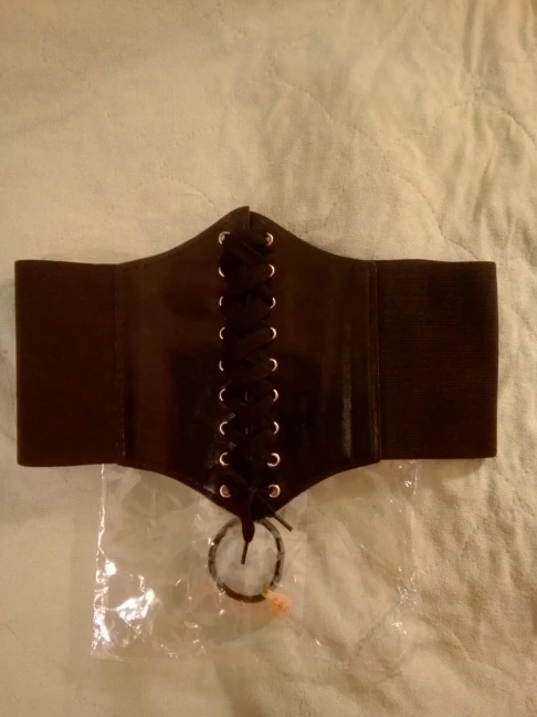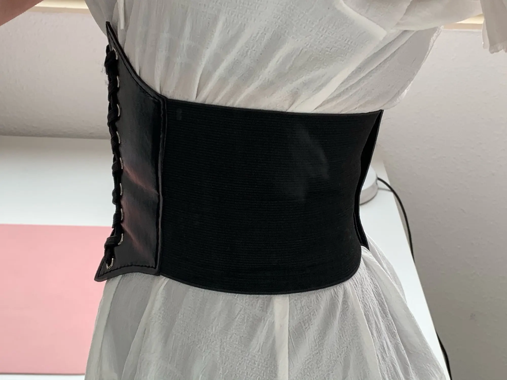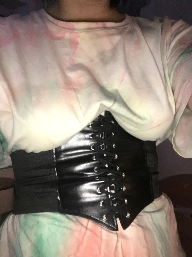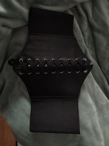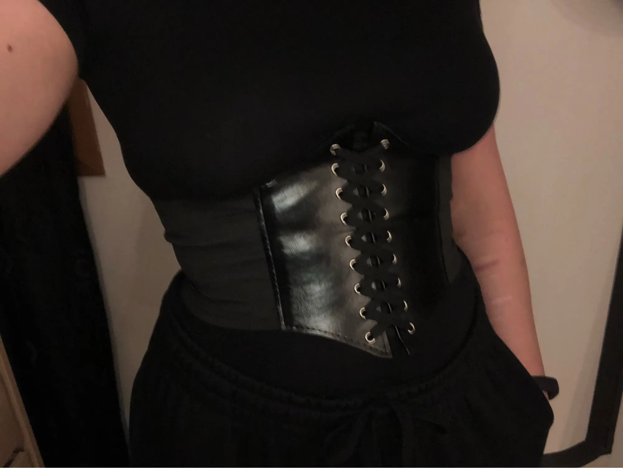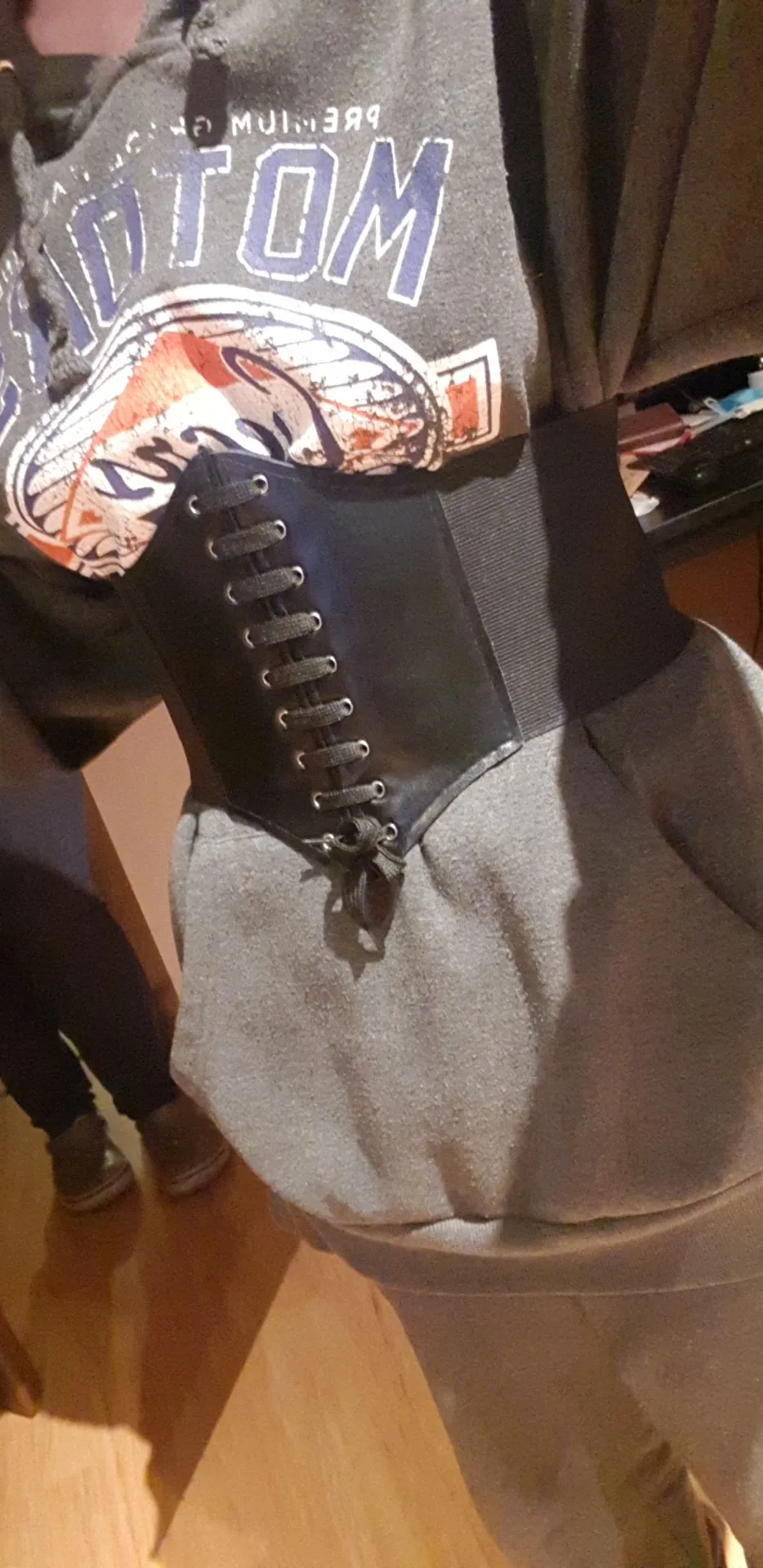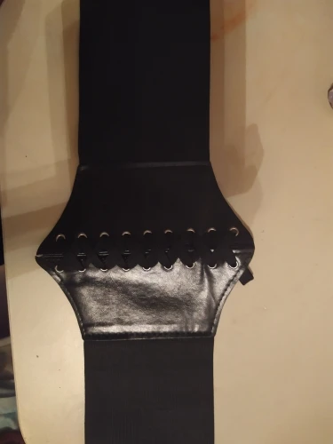 Очень модный корсет. Сшит хорошо. Спереди деталь на шнуровке из экокожи, потом широкая резинка, сзади на липучке.