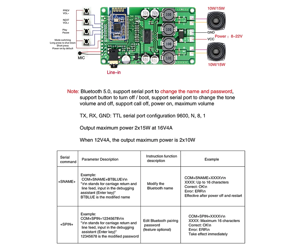 Беспроводная плата AIYIMA, Bluetooth 5,0, 2x15 Вт, поддержка AUX, последовательная команда, изменение имени, пароль