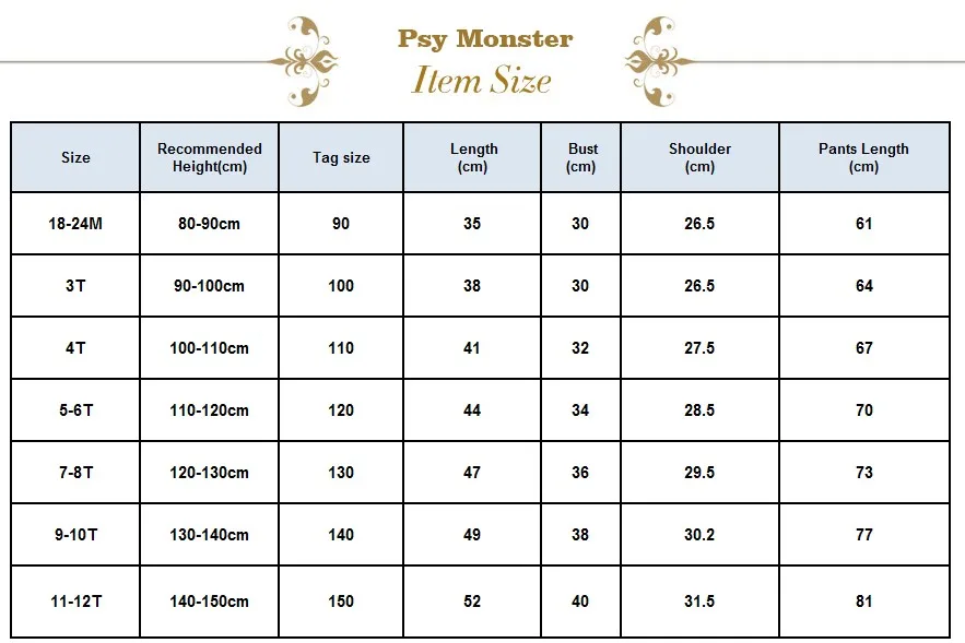 РазмерРекомендуетсяВысота (см)БиркаРазмерДлина(См)Бюст(См)Плечо(См)БрюкиДлина(См)18-24 м80-90 см90353026,5613T90-100 см100383026,5644Т100-110 см110413227,567От 5 до 6 лет110-120 см120443428,570От 7 до 8 лет120-130 см130473629,573От 9 до 10 лет130-140 см140493830,27711-12T140-150 см150524031,581