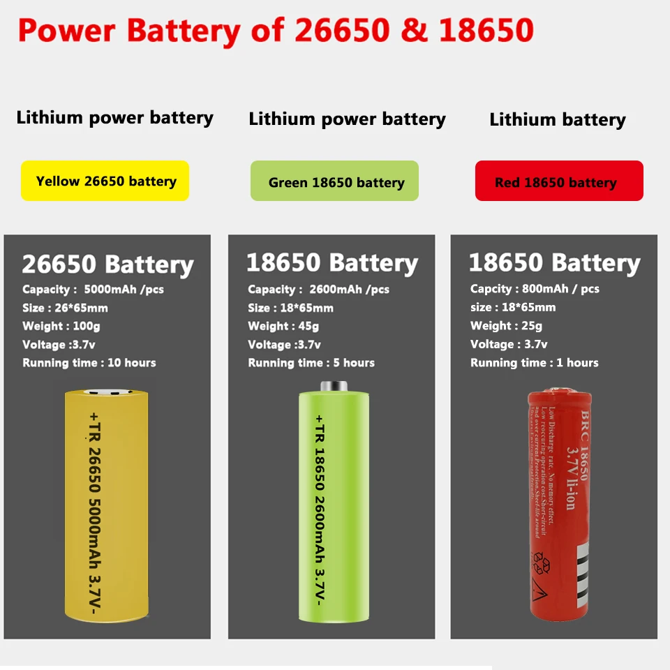 Power (XHP50)1* 18650 or 1* 26650 rechargeable battery