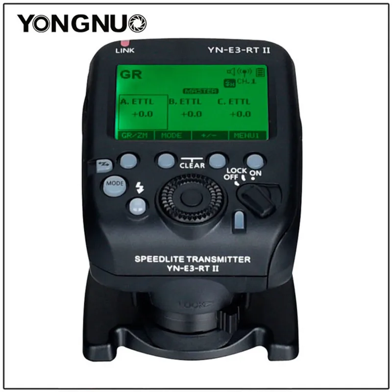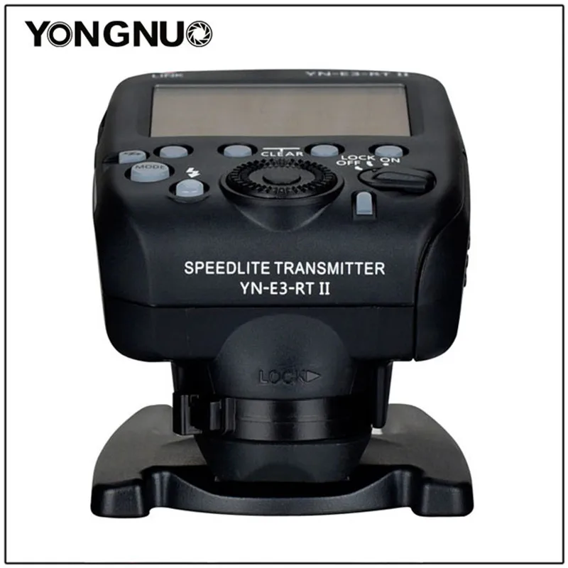 Передатчик YONYNUO speedlite YN-E3-RT II-это передатчик для беспроводной вспышки. Он может управлять до 5 групп (15 единиц) speedlites, которые имеют беспроводную функцию множественной вспышки, используя передаточную передачу.