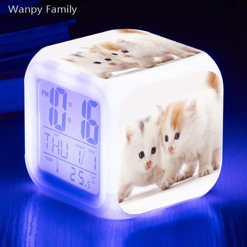 Милый белый Ktten, кот, светодиодный Будильник, 7 цветов, светящиес...