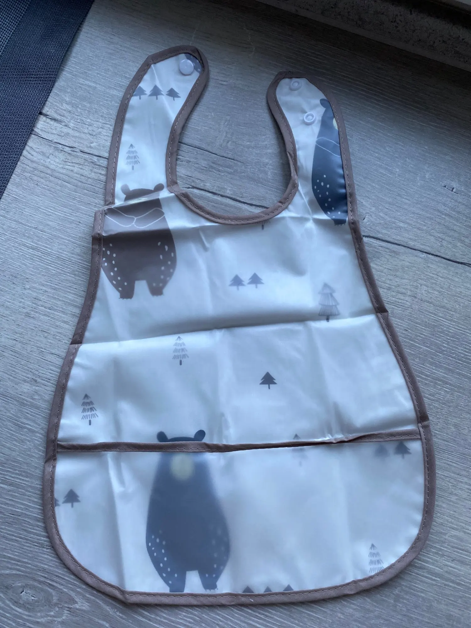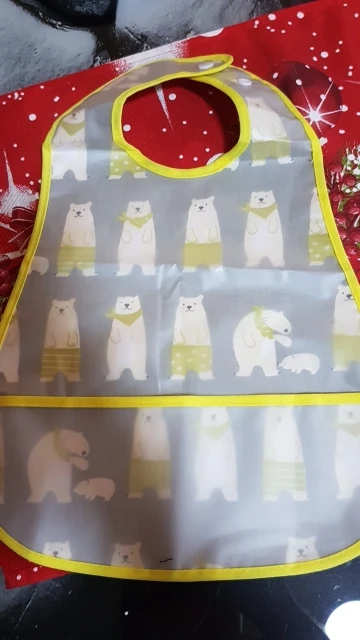 Симпатичный фартук, сверху непромакаемый, снизу ткань. Проверку супом прошел))) ребенку в 1.5 года в самый раз, регулируется на шее, есть запас, застегнули на первую кнопку.