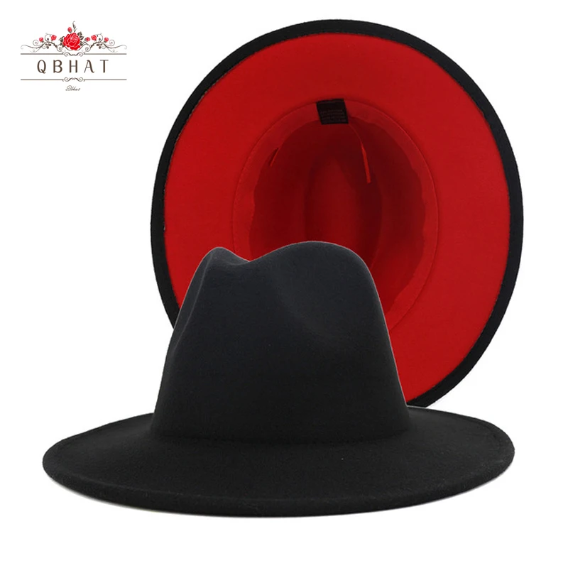 Фетровая шляпа QBHAT с широкими полями для мужчин и женщин, фетровая шляпа в стиле пэчворк, с шерстью, в стиле джаз, для торжественных случаев, чёрная, красная