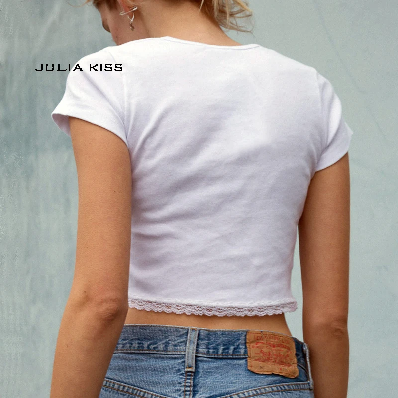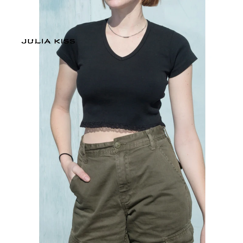 Женская мягкая и эластичная хлопковая укороченная футболка с V-образным вырезом и кружевной отделкой