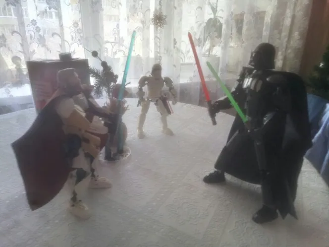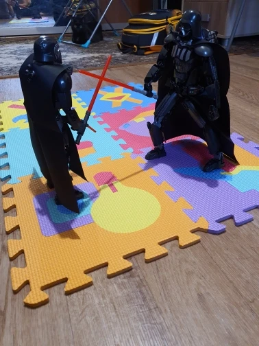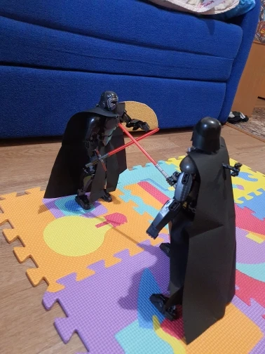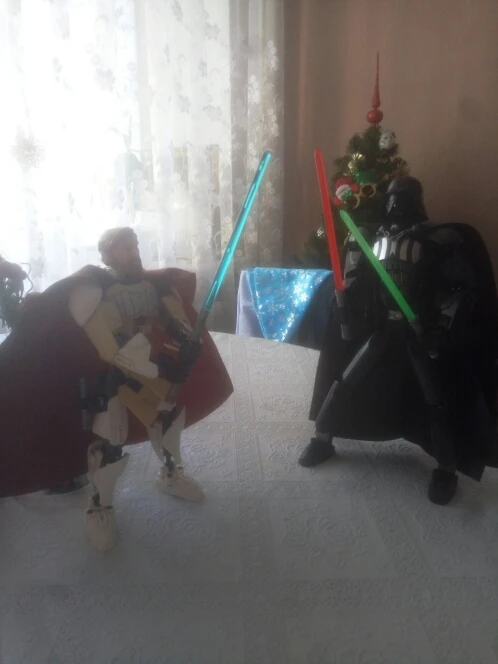 Все детали на месте, туго крепятся, одна деталь треснула на ноге при попытке соединить детали, но этого принципе не видно. Голова и руки двигаются плавно. Ноги туго постоянно вылетают шарниры(сустав), нужно придерживать и менять положение , а затем снова вставлять сустав обратно. Поскольку фигурка бралась,как фигурка,не играть, поэтому как стоит так и будет стоять, в таком случае манипуляции с ногами разовая. Мечи в темноте будут светится ,если на них посветить ультрафиолетовым фонариком. Два меча зелёных,два голубых, в темноте светятся все зелёным. Не порядок. Хотелось чтобы светились два голубым. Фигурка большая, в моем согнутом положении в высоту получилось 29см.