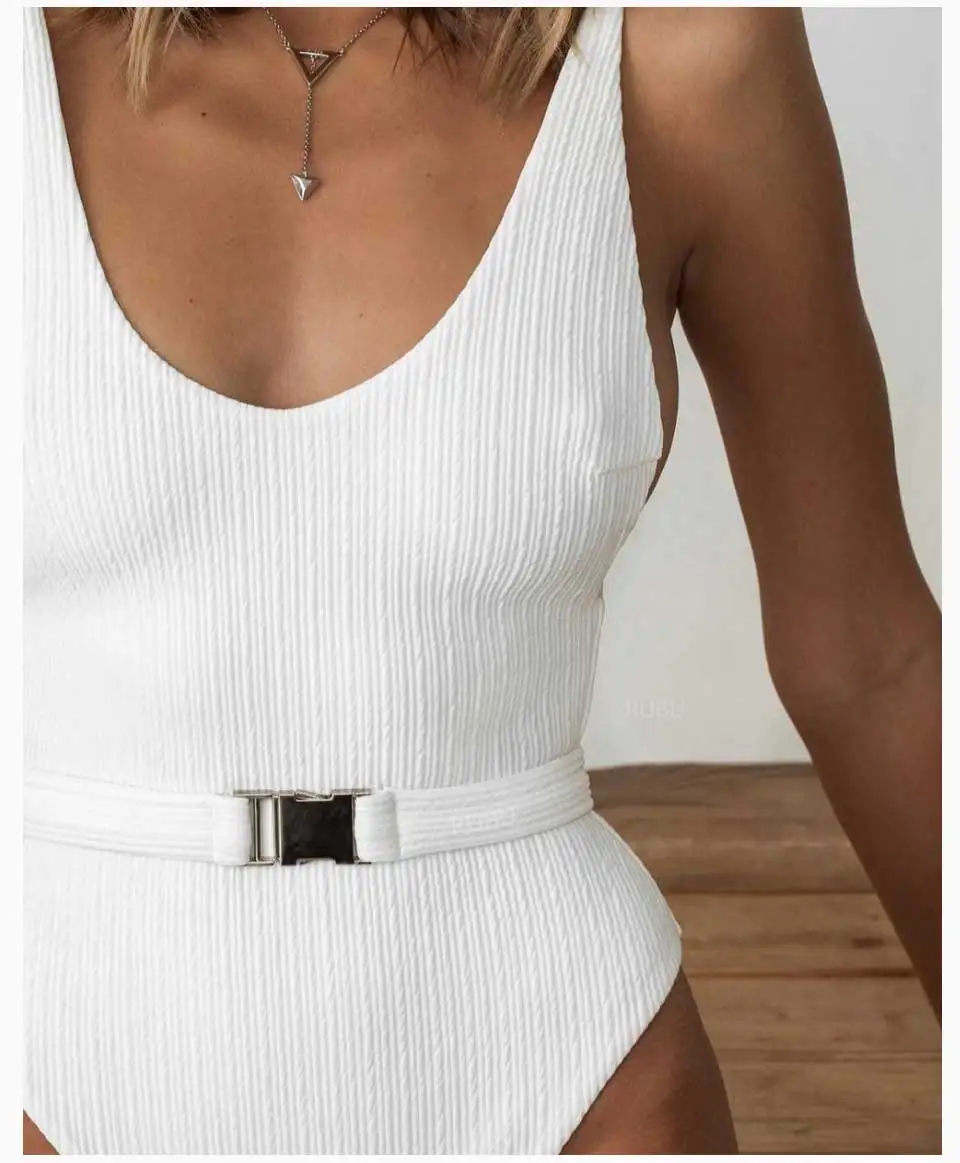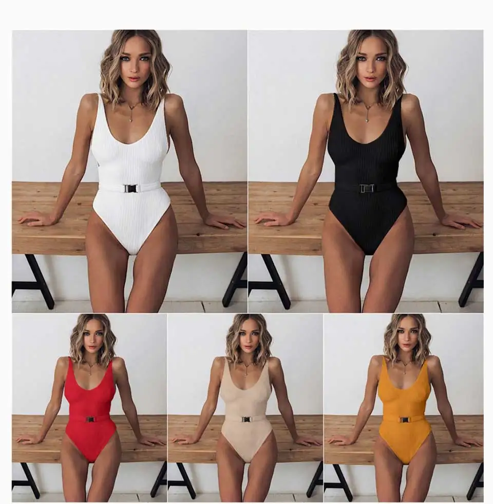 Однотонный цельный купальный костюм, ребристый черный купальный костюм с ремнем с пряжкой, купальник для женщин, пикантный монокини с высоким вырезом, мягкая одежда для плавания