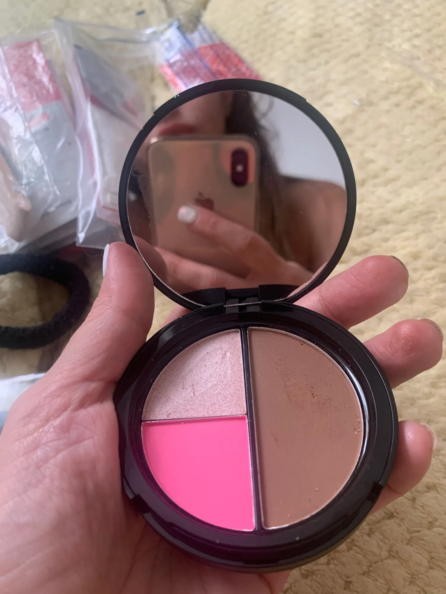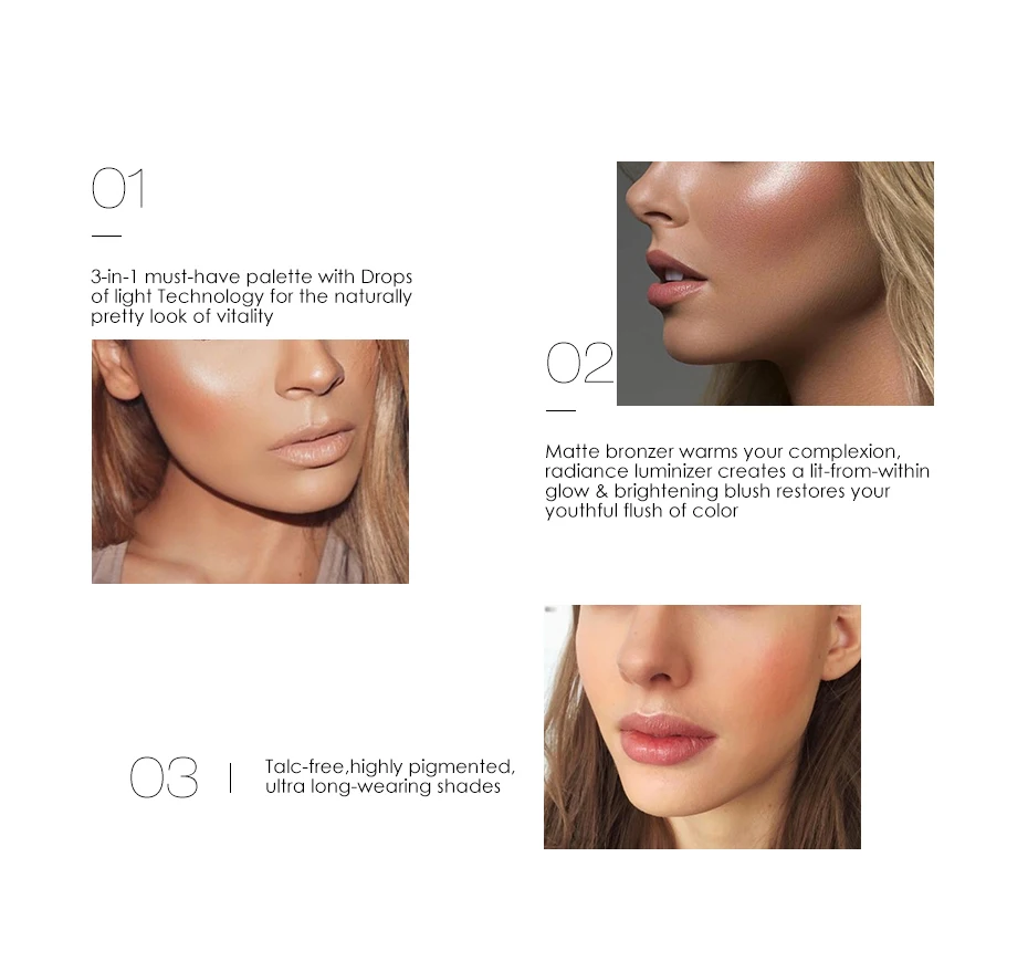 Хайлайтер и бронзатор для лица, пудра, бархатная отбеливающая текстура в палитре Выделите, цвет и контур Благодаря универсальному, легкому в использовании динамическому духу, который содержит бархатистый и гладкий светящийся порошок для pro-мелирования и матовый бронзирующий порошок для идеальной контурности, бронзовые щеки. Эта уникальная формула не содержит масла, аромата и талька, отлично подходит для всех типов кожи. В комплекте с суперразмерным зеркалом Этот гламурный компакт идеально подходит для светящейся красной ковровой дорожки! Особенности:3 цвета в палитре, один мерцающий цвет для подсветки, один матовый бронзирующий порошок для бронзовых щек.Ингредиент для контроля маслаУльтратонкая пудра, создающая естественное покрытие для макияжа Подробности:Вес нетто: 8,4 гАбсолютно новый в розничной упаковке Состав:Слюда, тальк, этилгексил пальмитат, Нейлон-12, стеарат цинка, алюминиевый крахмал октенилсукцинат, дегидроацетат натрия, феноксиэтанол, сорбиновая кислота. Может содержать: диоксид титана (CI 77891), оксиды железа (CI 77491, CI 77492, CI 77499), оксихлорид висмута (CI 77163), марганцевый фиолетовый (CI 77742). Гарантия качестваЛицензия здравоохранения: GD.FDA29-XK-3276Лицензия на производство: XK16-108 8553