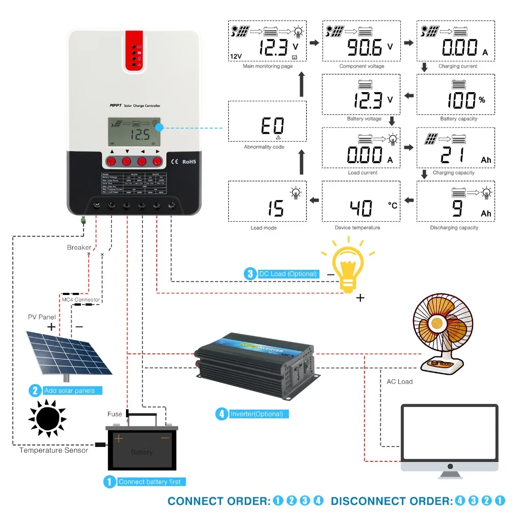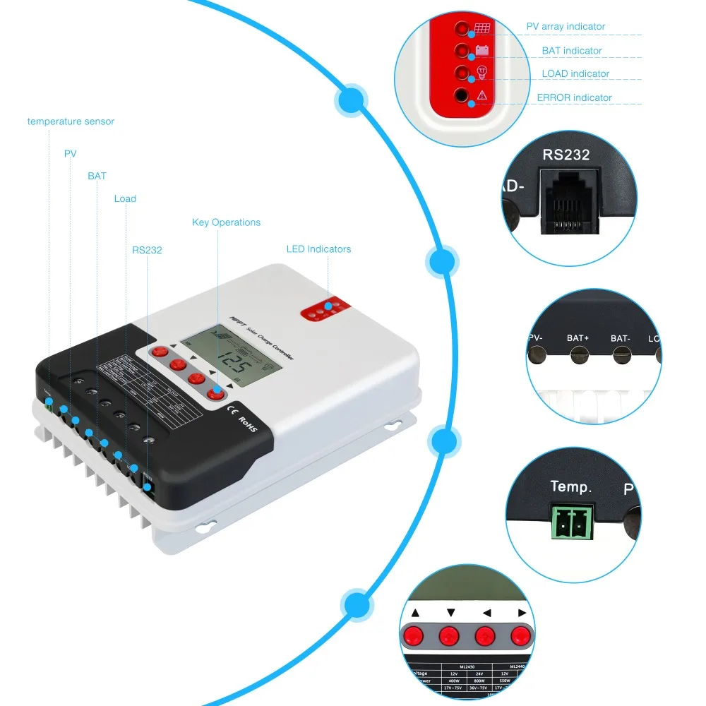 Этот продукт может контролировать генерирующую энергию солнечной панели и отслеживать самые высокие значения напряжения и тока (VI) в реальном времени, позволяя системе заряжать батарею в максимальной мощности. Он предназначен для использования в автономных солнечных фотоэлектрических системах для координатной работы солнечной панели, батареи и нагрузки, в качестве основного блока управления в автономных фотоэлектрических системах.