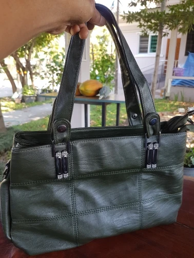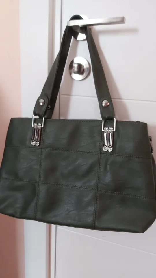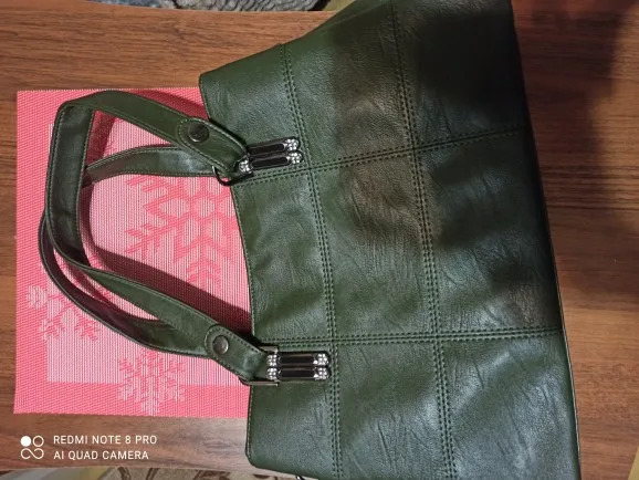 доставка не затянута, получила на почте. описанию сумочка соответствует, зелёный цвет не хаки, как я предполагала, а именно болотно зелёный. фурнитура хорошая, на лицевой стороне крепление ручек украшено стразами. размер соответствует описанию. на мой вкус ручки должны быть чуть длиннее, чтобы сумочка смотрелась более гармонично. на моей сумке маленький недочет- чуть напутаны нитки на ручке,и есть неприятный запах внутри....поэтому твердая 4.а в общем очень рекомендую, прекрасный вариант на повседневку. Спасибо продавцу за товар ,маленький подарочек и хорошую упаковку.