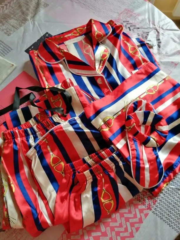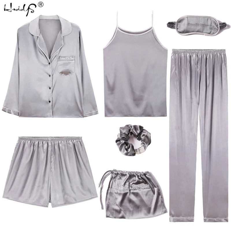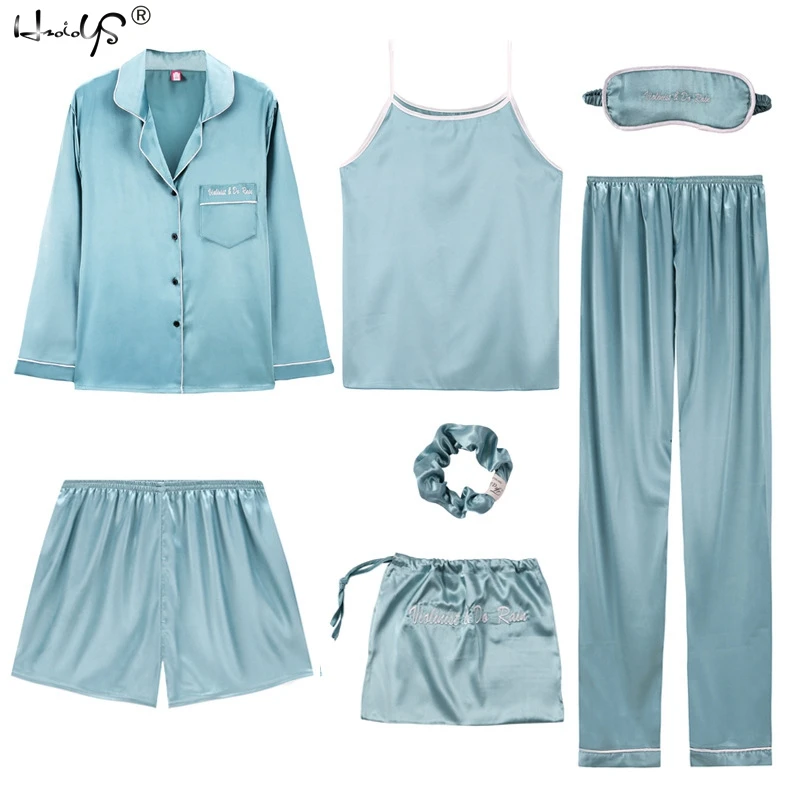 Пижамный комплект женский из 7 предметов, атласная Шелковая пижама в полоску, милая Домашняя одежда, длинная и короткая Пижама