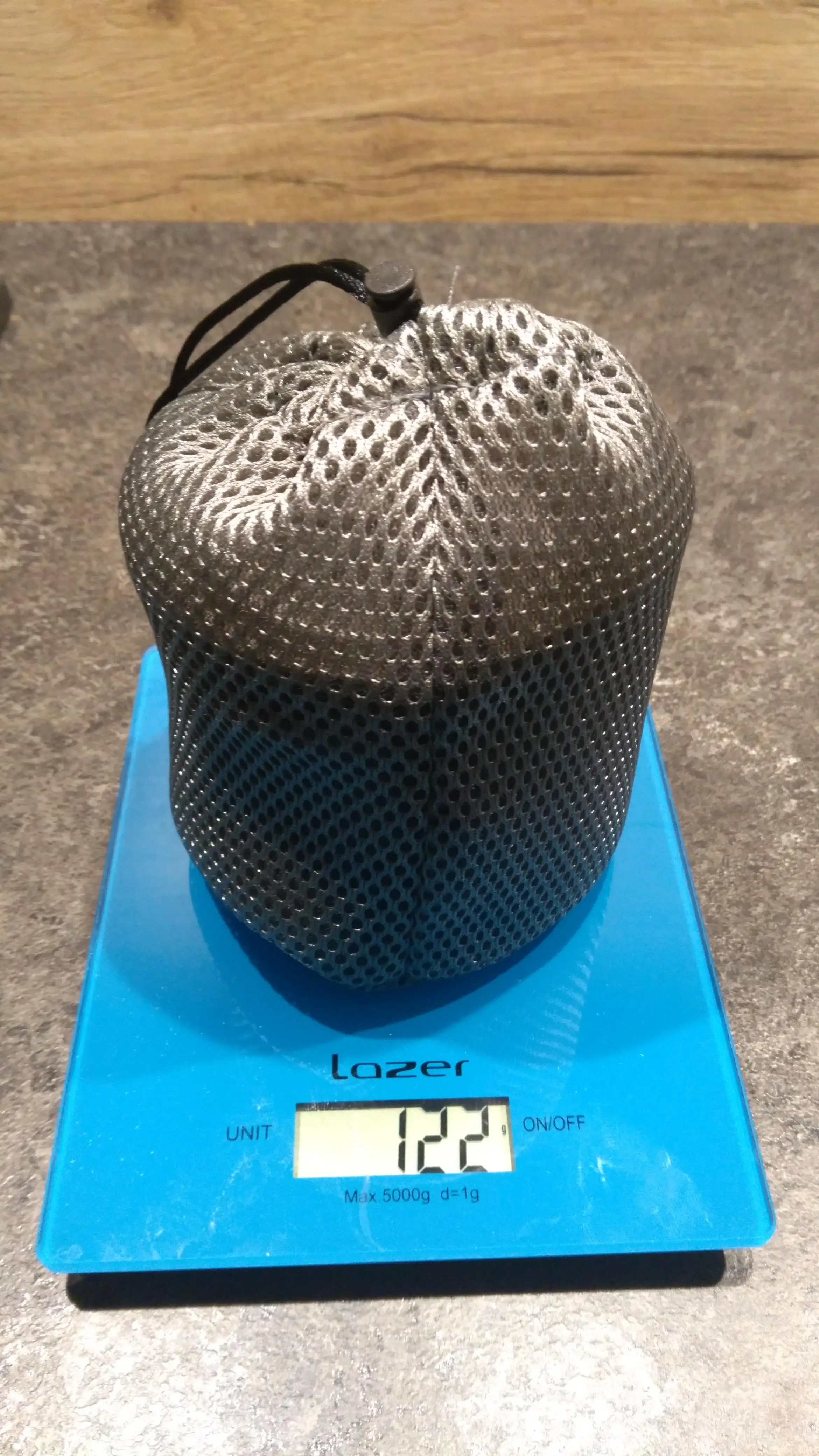 Чашка 96 г, крышка кастрюли 24 г, Сетчатая Сумка 15 г. Всего 135 г, тяжелее, чем рекламируется. Тем не менее продукт выглядит хорошо.