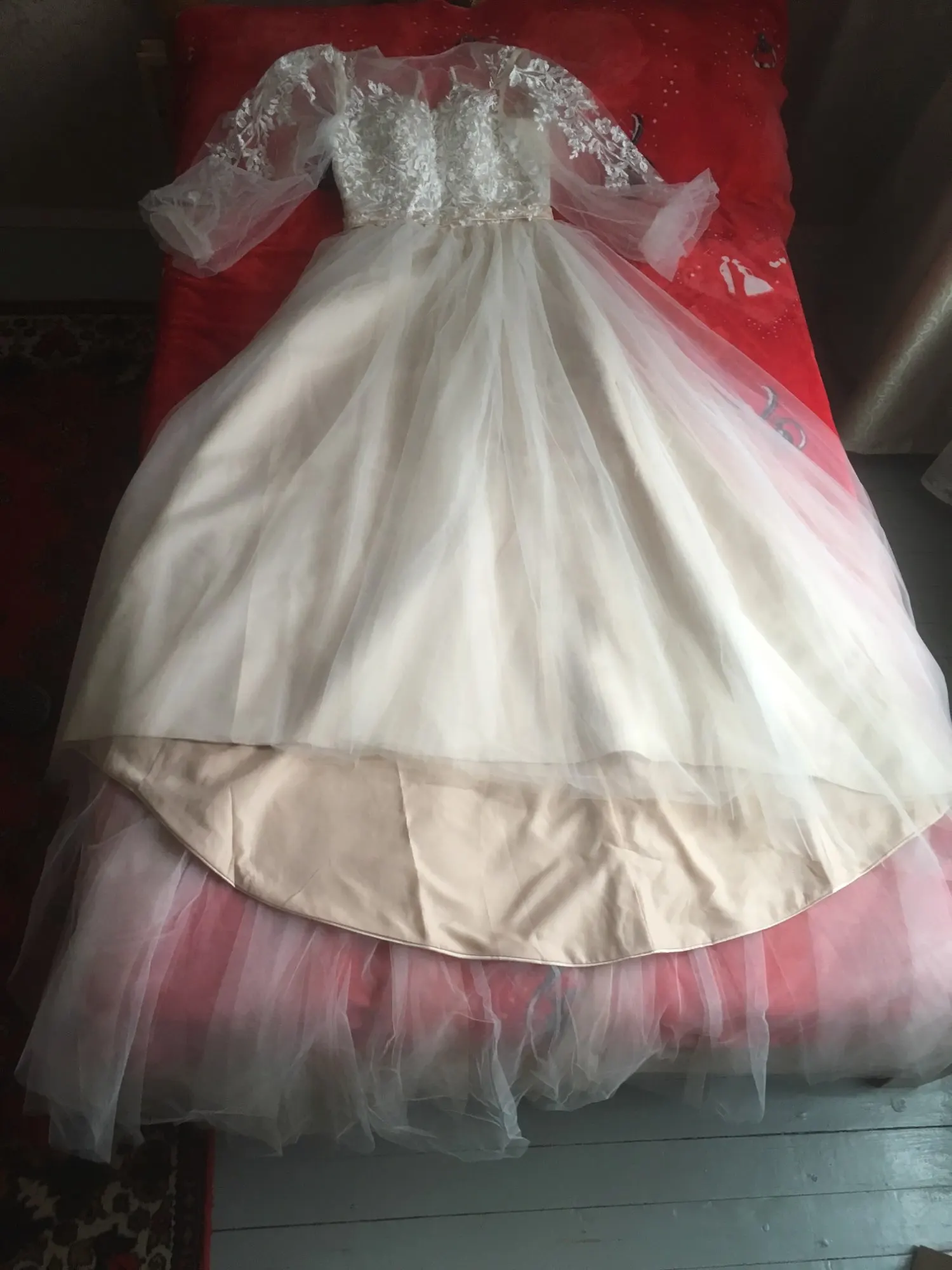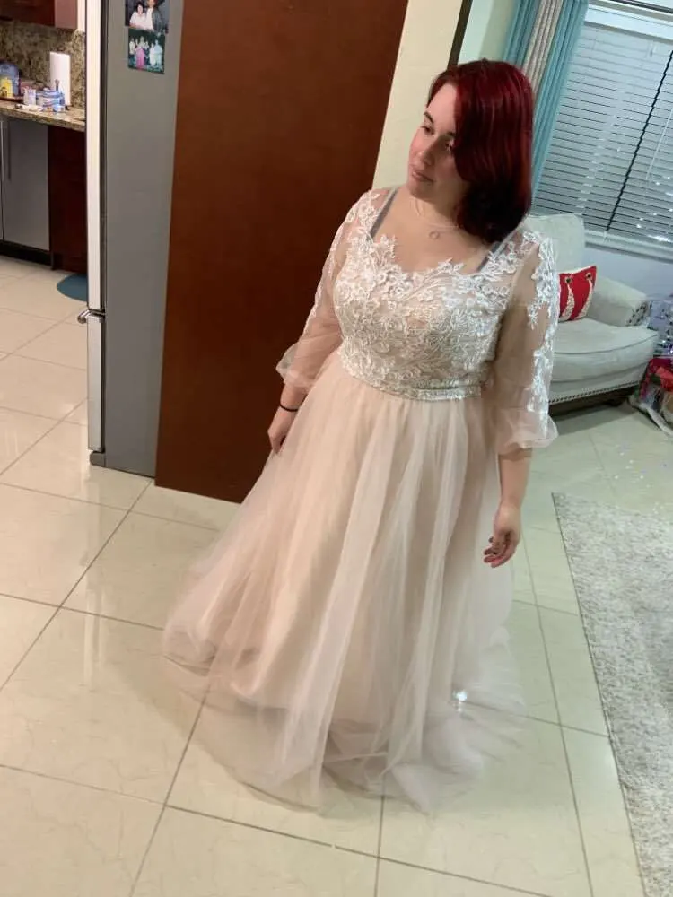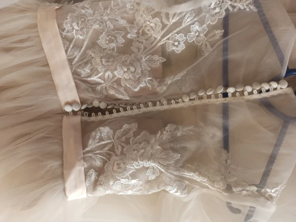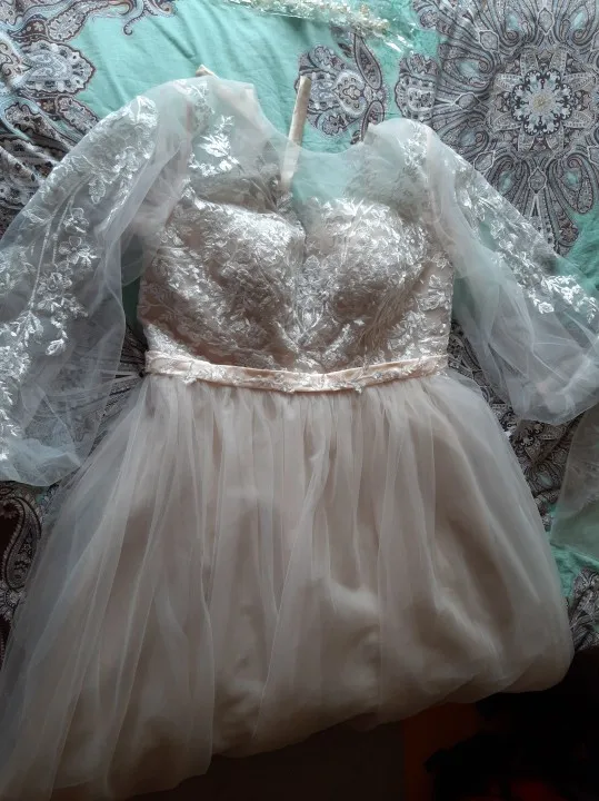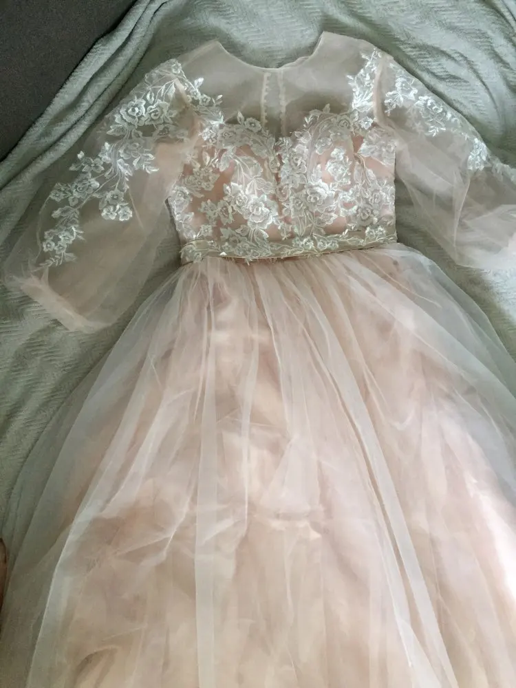 Это абсолютно красиво! Покупки и доставка были быстрее, чем я ожидал. Я влюблен в это платье. Все детали и кружева прекрасно пришиты. Никаких ниток и таковых. Единственное, что я хотел бы изменить, это область подмышек, причина только в том, что я попробовал поднимать руки высоко, потому что когда я занимаюсь спинами для моего свадебного танца, И я испугалась, что если я поднимусь на высоту, я бы порвала платье. Кроме того, он идеален.