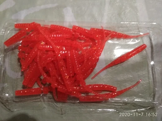 Заказ пришёл быстро, резина понравилась, запах креветки присутствует на вид резина классная на открытой воде проверим, продавца и товар рекомендую