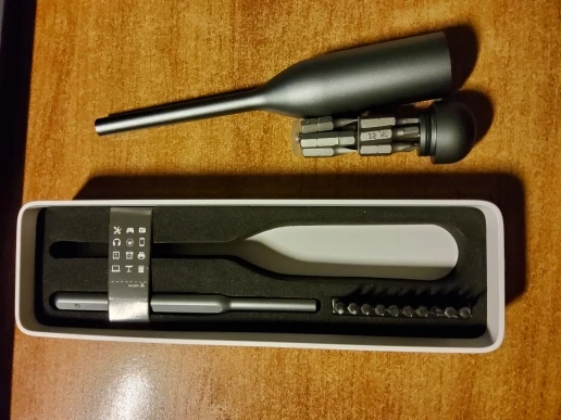 Качество хуже чем у набора с мелкой отверткой, крышка коробки не держится, отсек для бит без смазки открывался туго, но в целом отвертка отличная 4,5/5