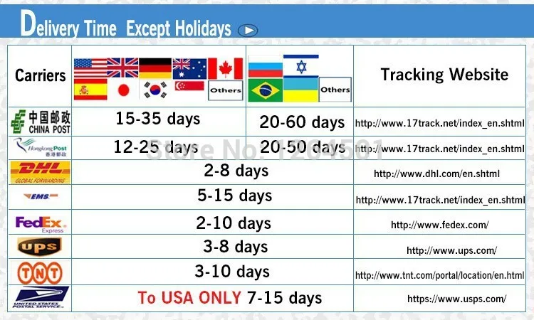 We will be able to get them shipped via DHL, EMS, HK AIR Mail upon your choice. Or we can offer you the most economical and safest shipping method. Our goal is to get your order reach you in best way you like.