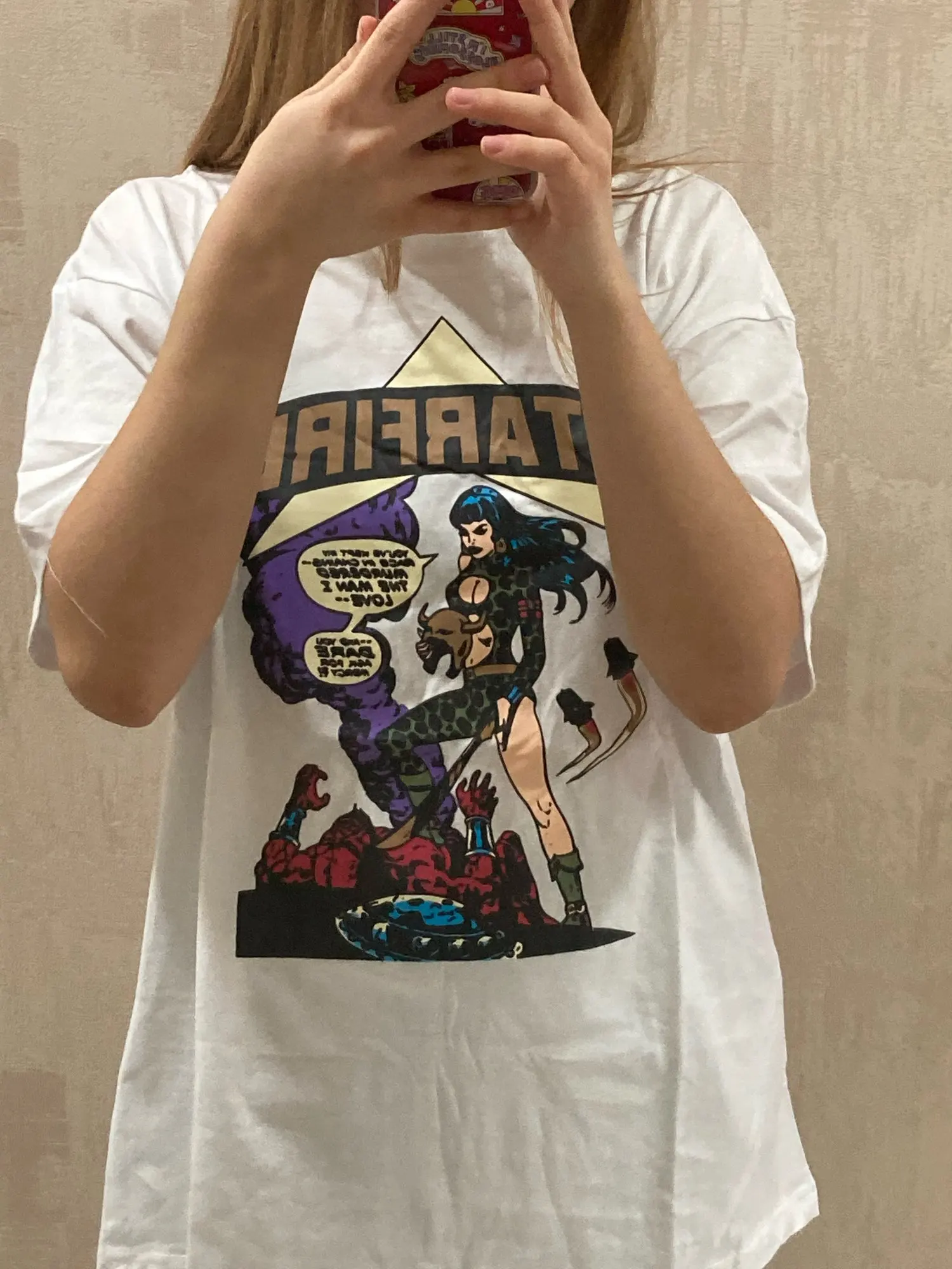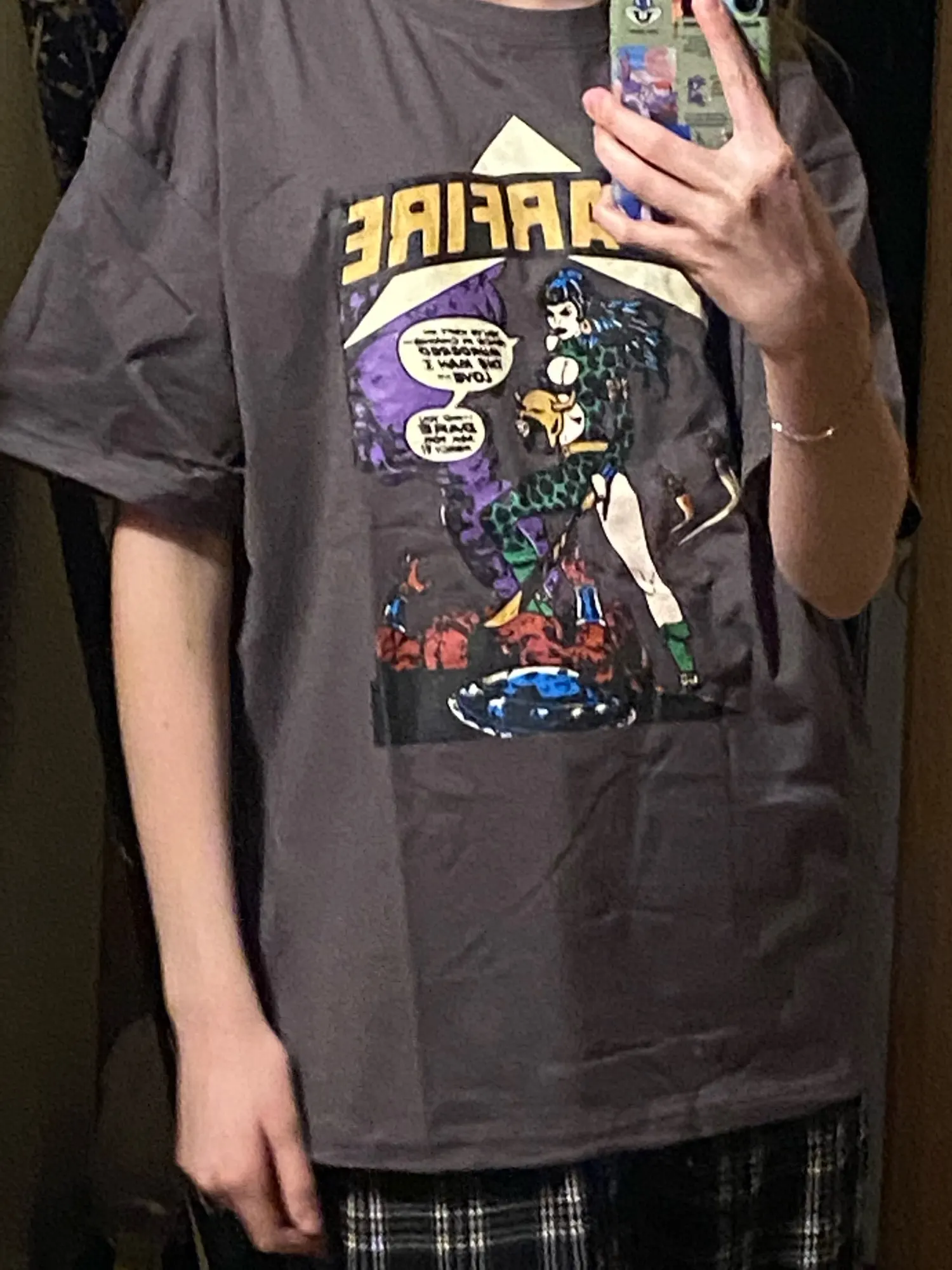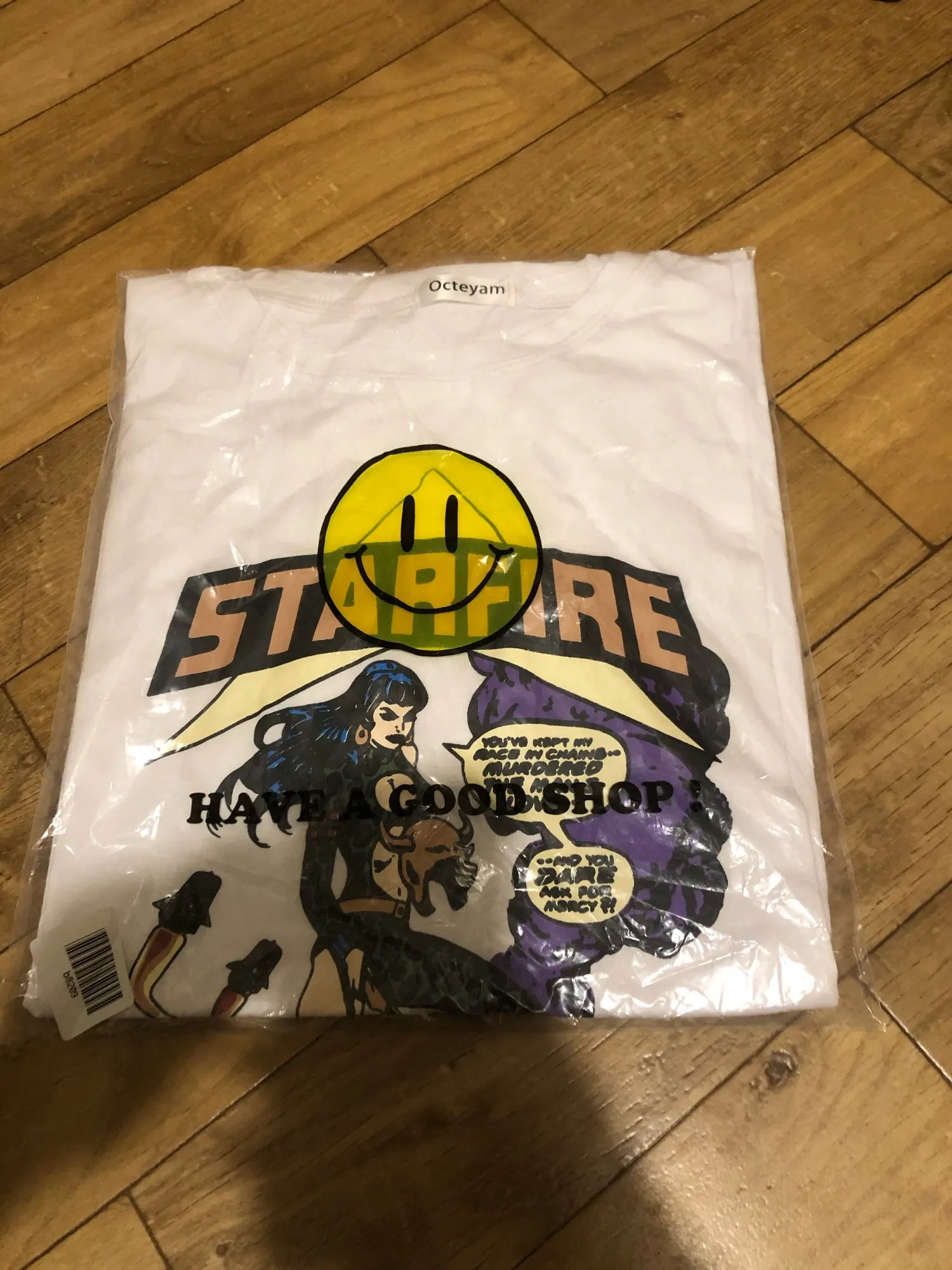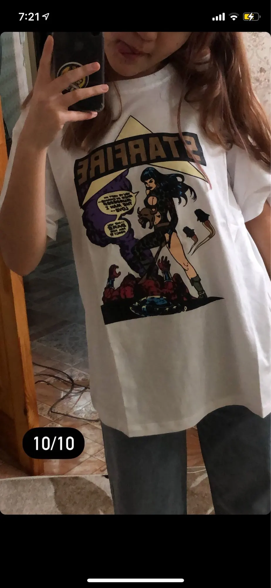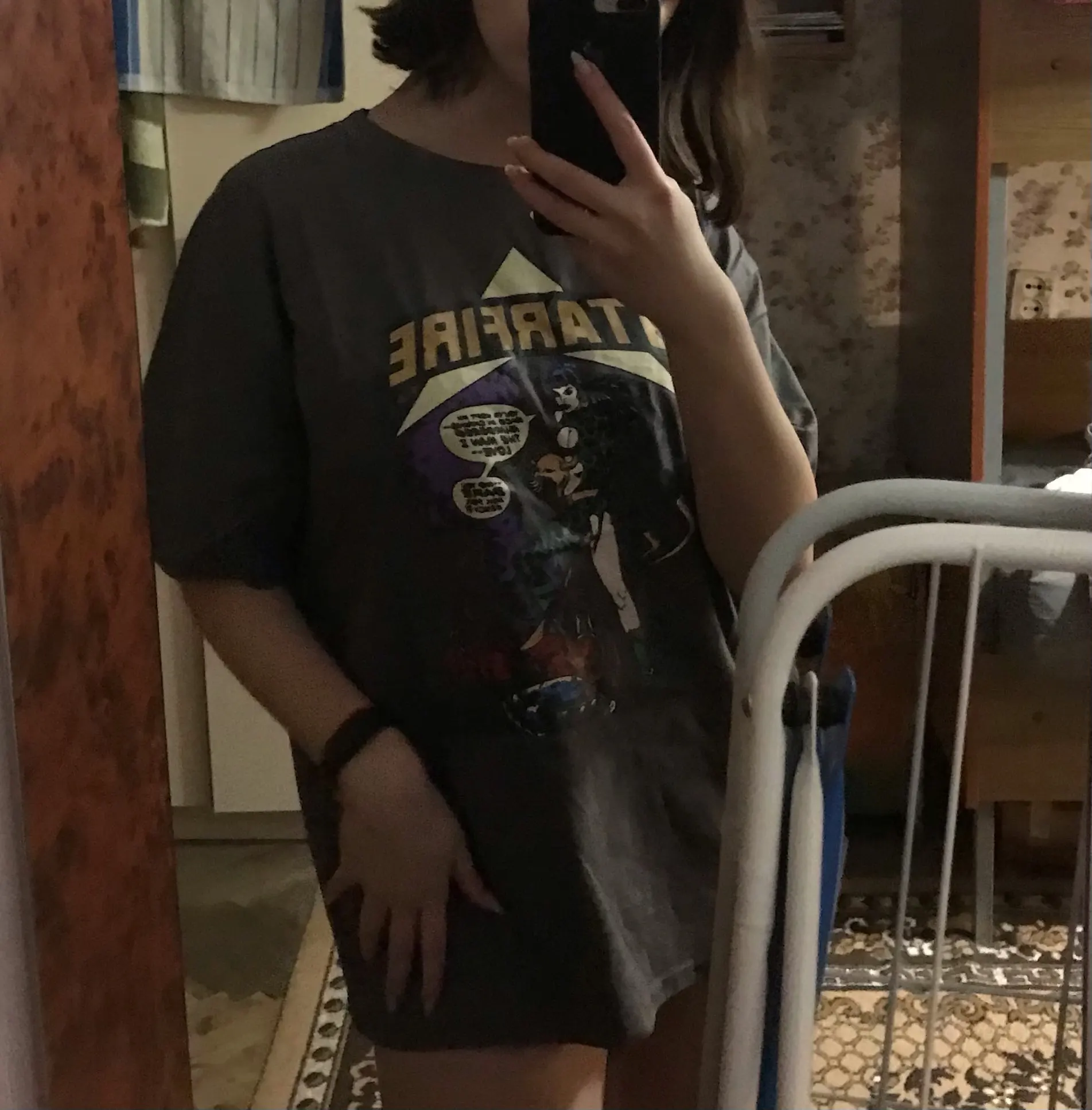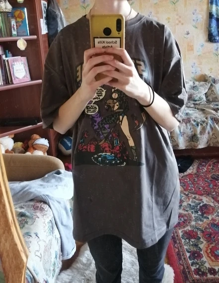 Футболка очень большая оказалась. Я думала она будет меньше по размеру,а она как будто бы XXL или XXXL. Я конечно понимаю что она должна быть oversize,но это прям слишком oversize. А так сама футболка нормальная по качеству,хоть и с запахом.