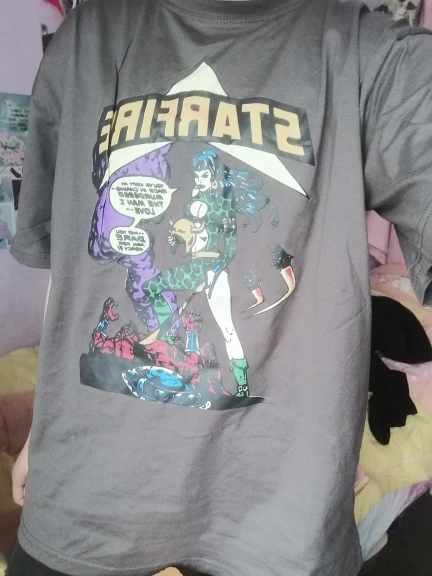 Товар пришёл быстро, за 2 недели примерно. Футболка чуть меньше, чем я ожидала, но я планирую похудеть, так что все уладится, я думаю) не просвечивает, упаковано хорошо. Принт даже если потрескается со временем, я думаю, будет выглядеть презентабельно.