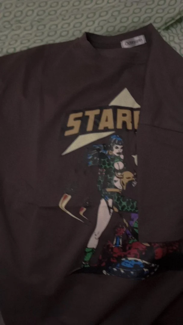 Мне нравится. Но принт не является тканевым принтом, а выглядит как наклейка. Но выглядит хорошо. Я купил Размер M, рукава не очень широкие. Поэтому, если вам нужен размер S и рубашка большого размера, просто купите размер L. Упаковка аккуратная.