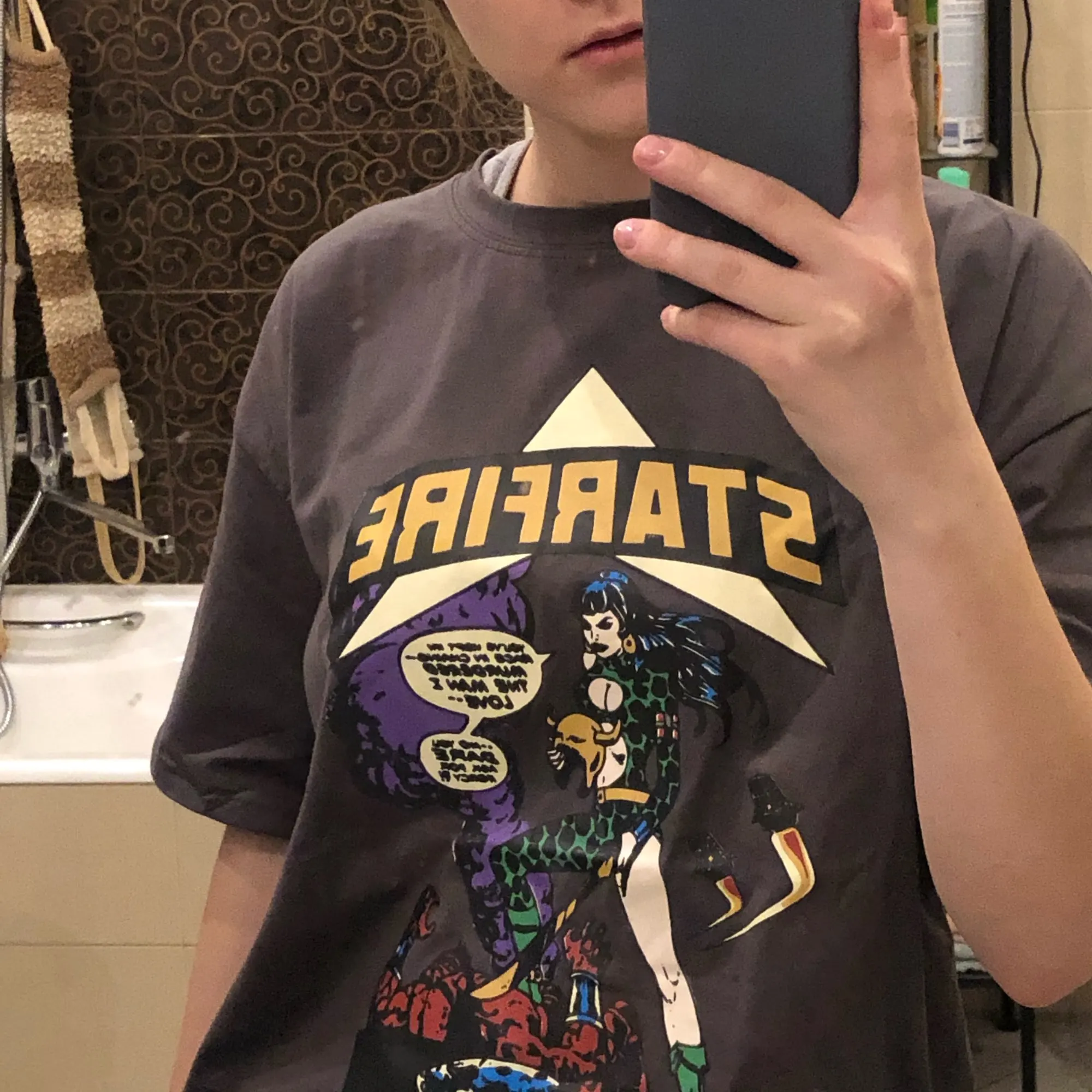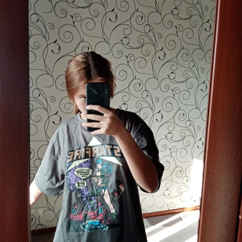 Она офигенная по качеству ткани, оверсайз, но рисунок наклейка, не знаю как поведёт себя после стирки