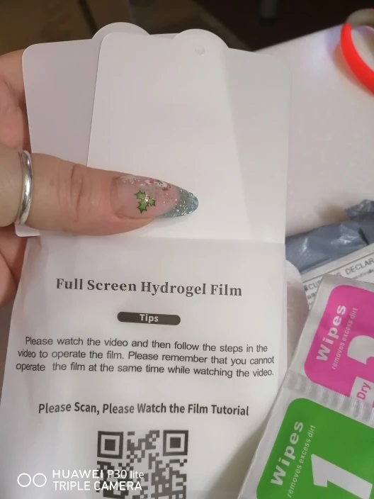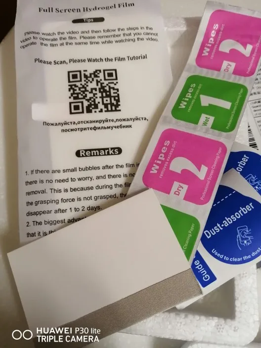 Посылка шла 3 месяца в Кемеровскую область. Гидрогелевая плёнка подошла на Huawei Mate 20 Pro. В комплекте 2 плёнки, салфетки. Плёнка отклеивается по краям, потому - что экран закругленный.