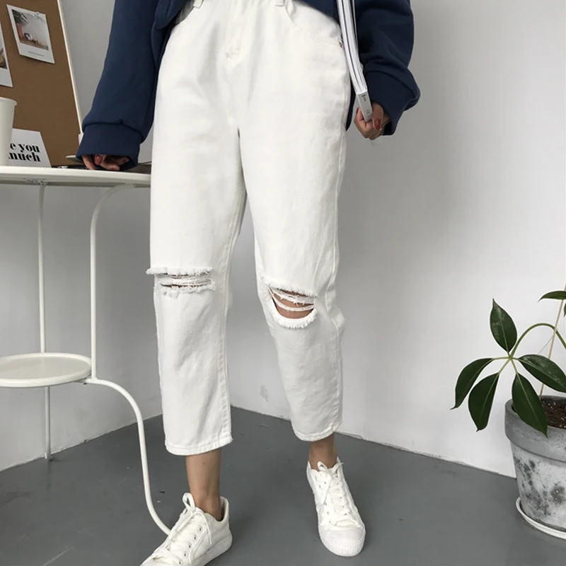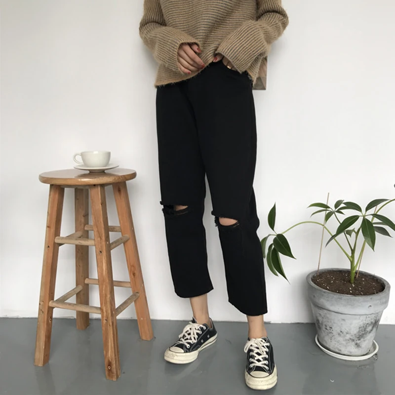 Джинсы женские прямые, рваные, с высокой талией, на молнии, длиной до щиколотки, базовые черные
