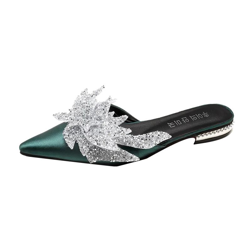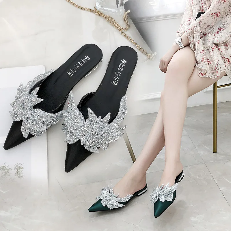 Женские атласные шлепанцы Koovan, летние шлепанцы на плоской подошве с острым носком, украшенные стразами и бабочками, новинка 2019
