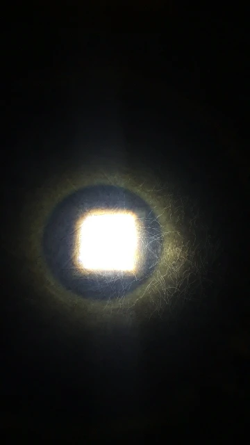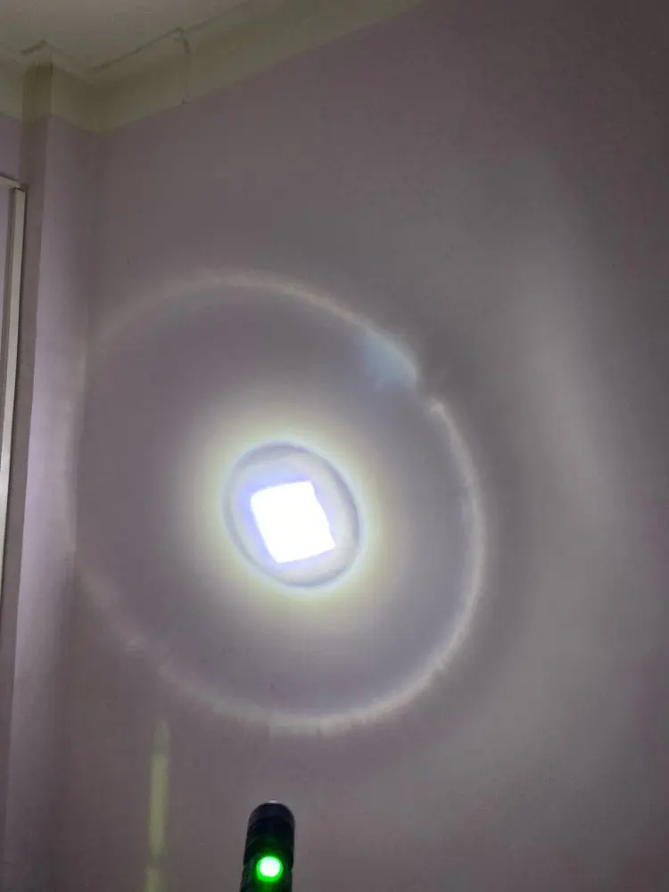 Светит ярко аккумулятор был в защите. Но пятно фонаря не четкое. Квадрат не симметричен. Но это придирка.
