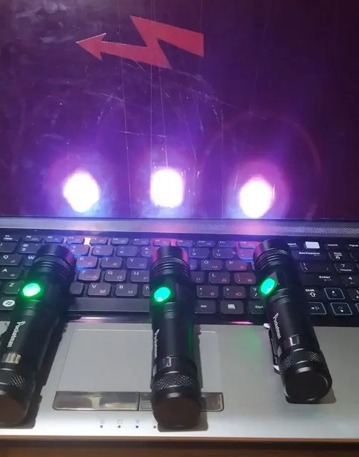 Фонарик классный! Светит ярко, при фокусировке светит очень далеко. В разряженном состоянии кнопка горит красным. При постановке на заряд - кнопка горит красным, как зарядится - загорается зеленый. Покупкой доволен! Спасибо, китаяц!