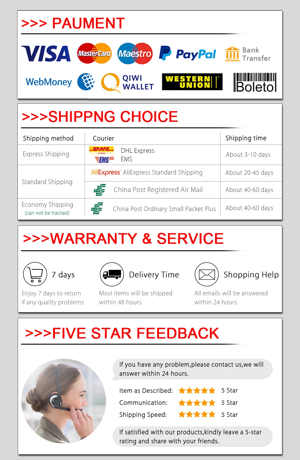 1: не беспокойтесь о скорости доставки, товары в нашем магазине имеют запас! После того, как вы разместите заказ, мы организуем отправку вовремя!