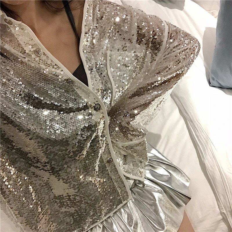 Женская блузка с блестками Cheerart, свободная блузка с длинным рукавом, белый и черный прозрачный топ, одежда для клуба