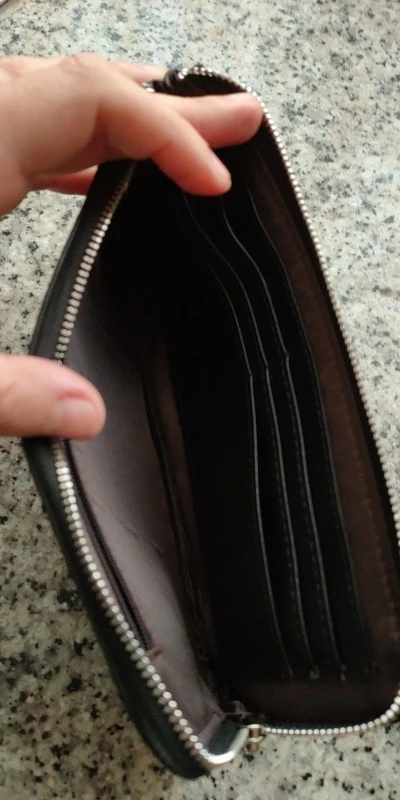 Приличная вещица. Телефон 5 дюймов легко входит. Внутри карман на молнии, карман для купюр, и карманы для карточек. Все аккуратно прошито. Практически без запаха