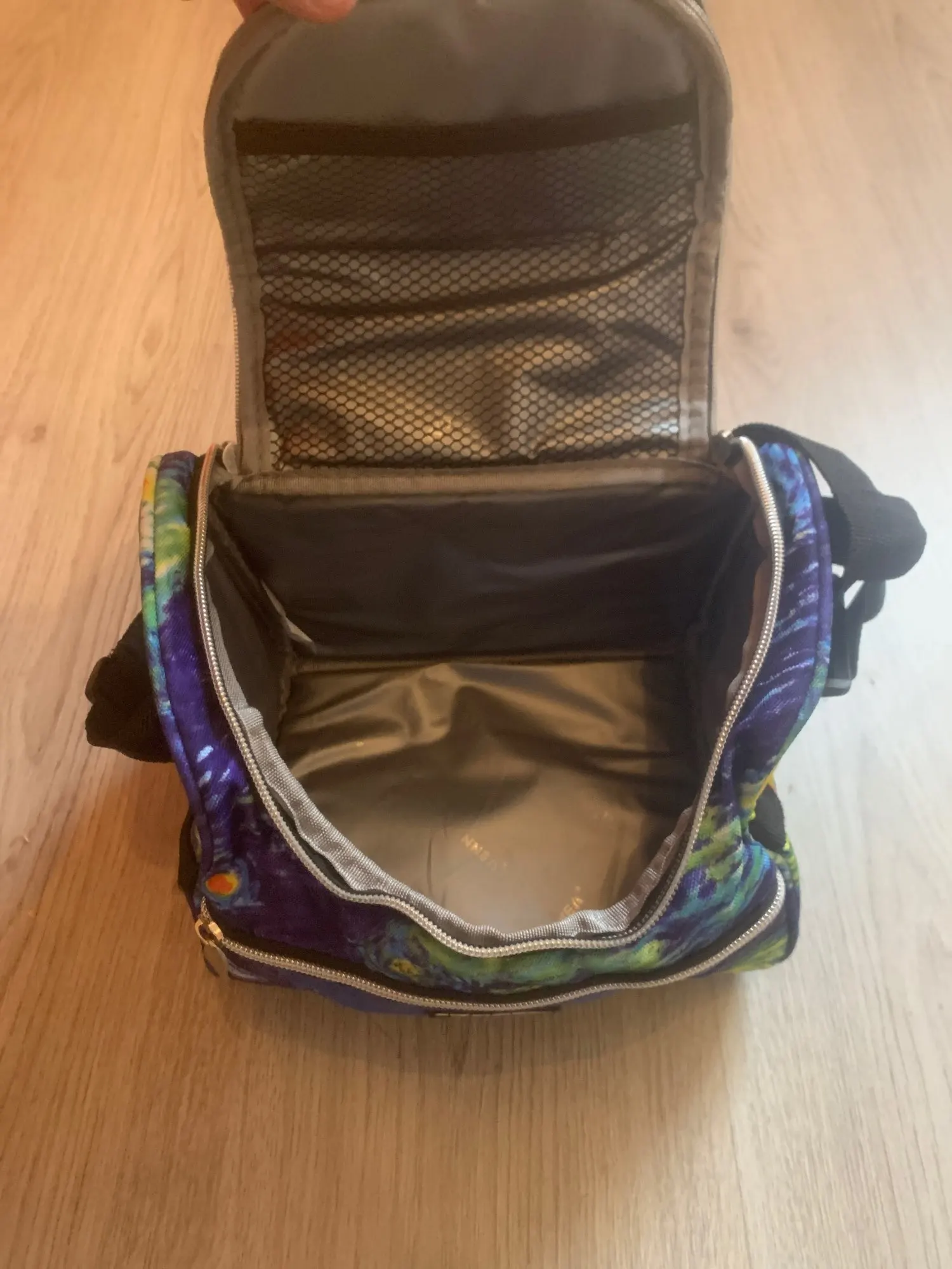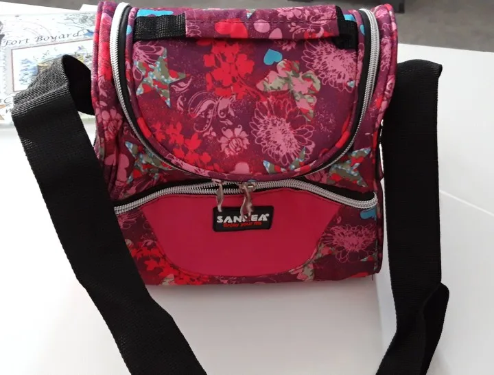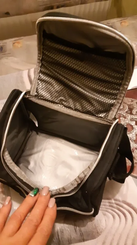 Сумочка сшита качественно, добротно. Пришла немного мятая, так как сложена была, но, думаю, что быстро расправится. Действительно, очень вместительная. Внутри всё обшито термозащитным материалом. Есть дополнительный карман - сеточка внутри (на крышке сумочки) и снаружи кармашик на замочке.